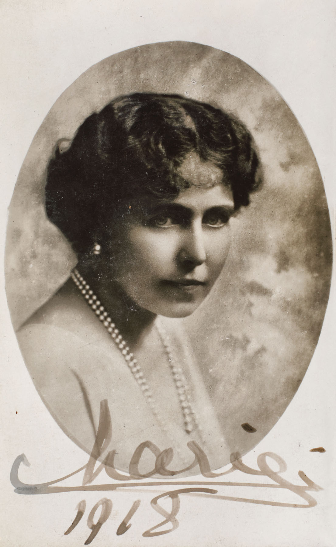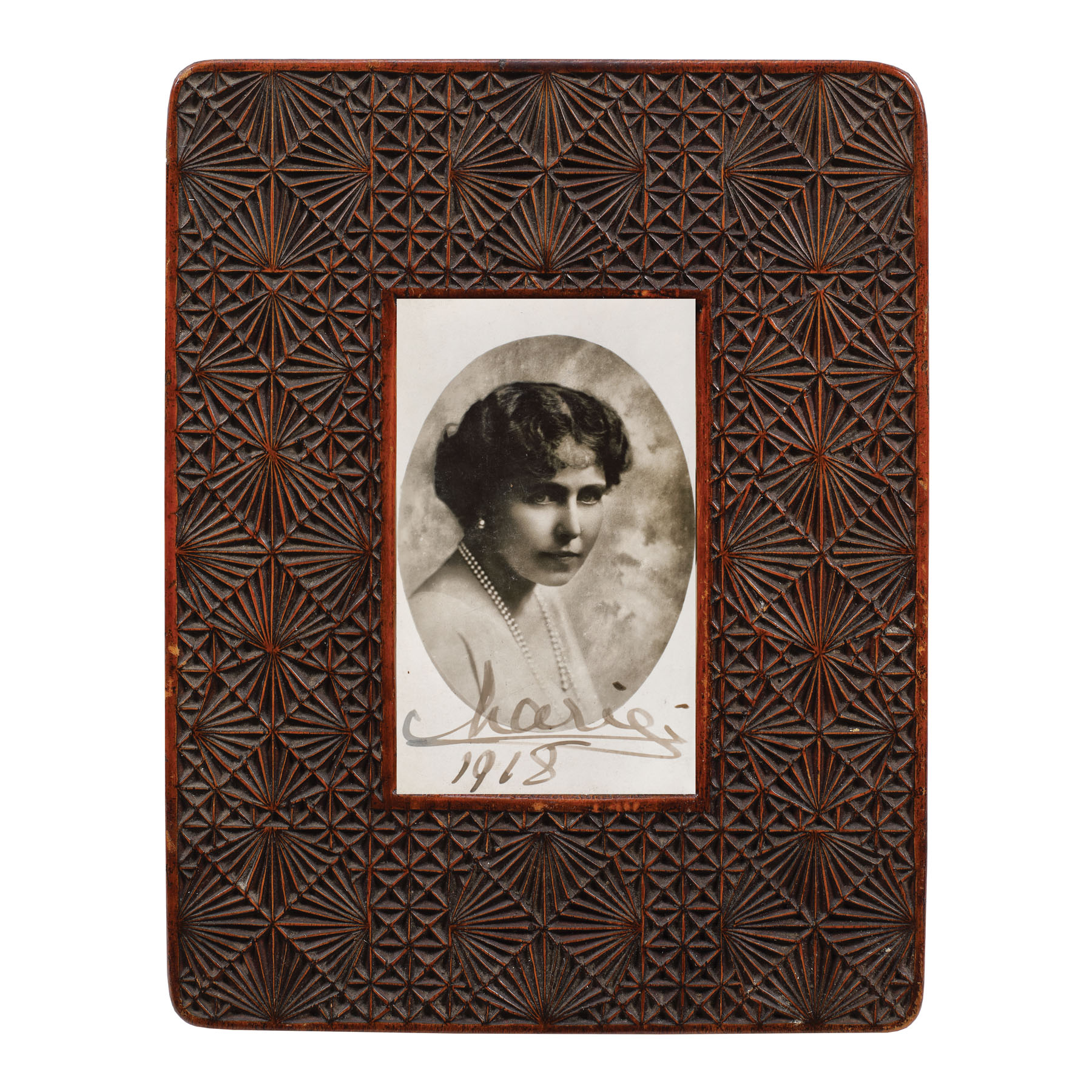 37. Fotografie ilustrând-o pe Principesa Maria, 1918, cu semnătura olografă a principesei, în ramă decorată cu motive Neo-brâncovenești