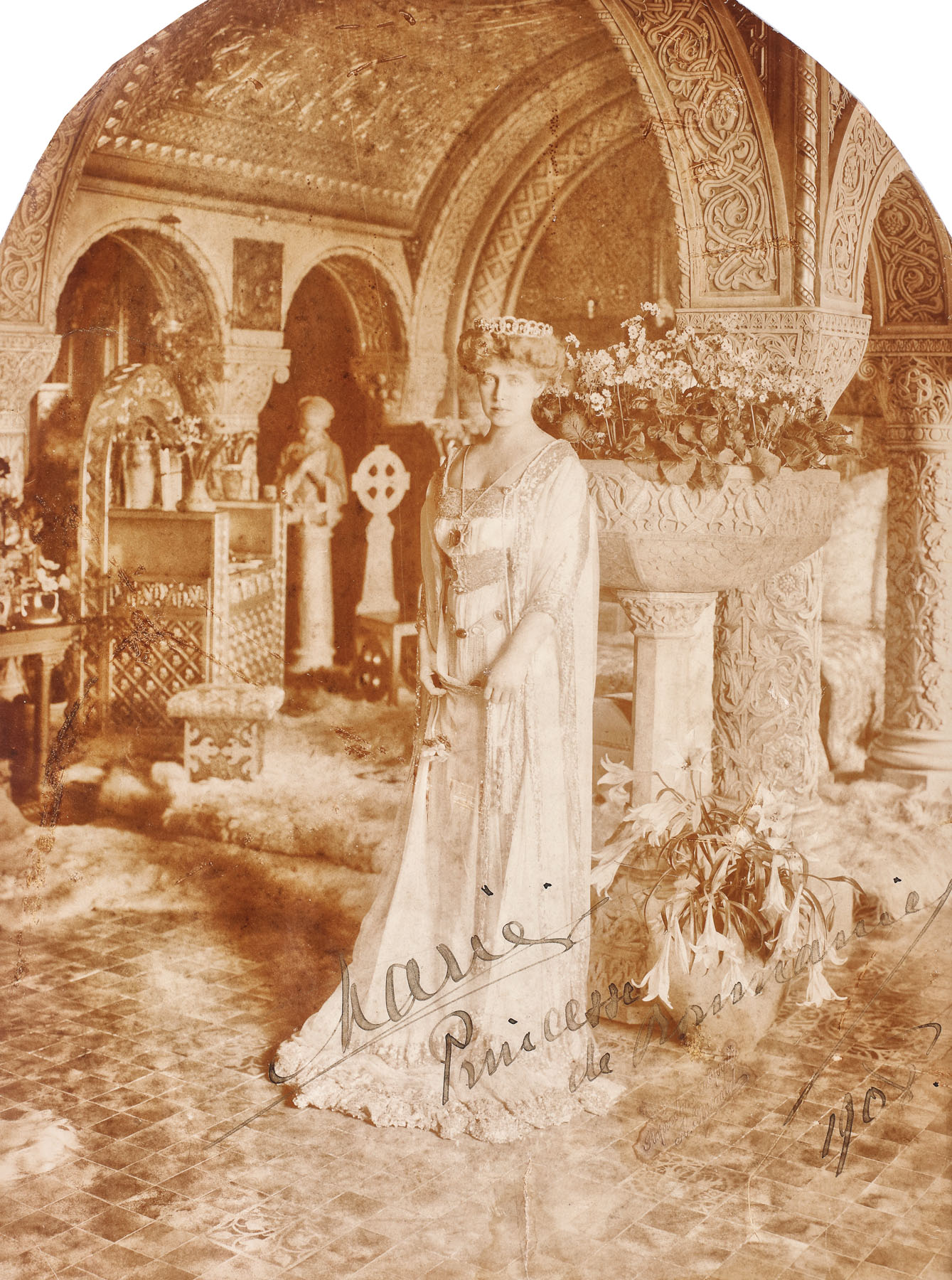 8. Fotografie ilustrând-o pe Principesa Maria în interiorul Palatului Cotroceni, cca. 1905, cu semnătura olografă a principesei, în ramă decorată cu motive celtice și Neo-brâncovenești