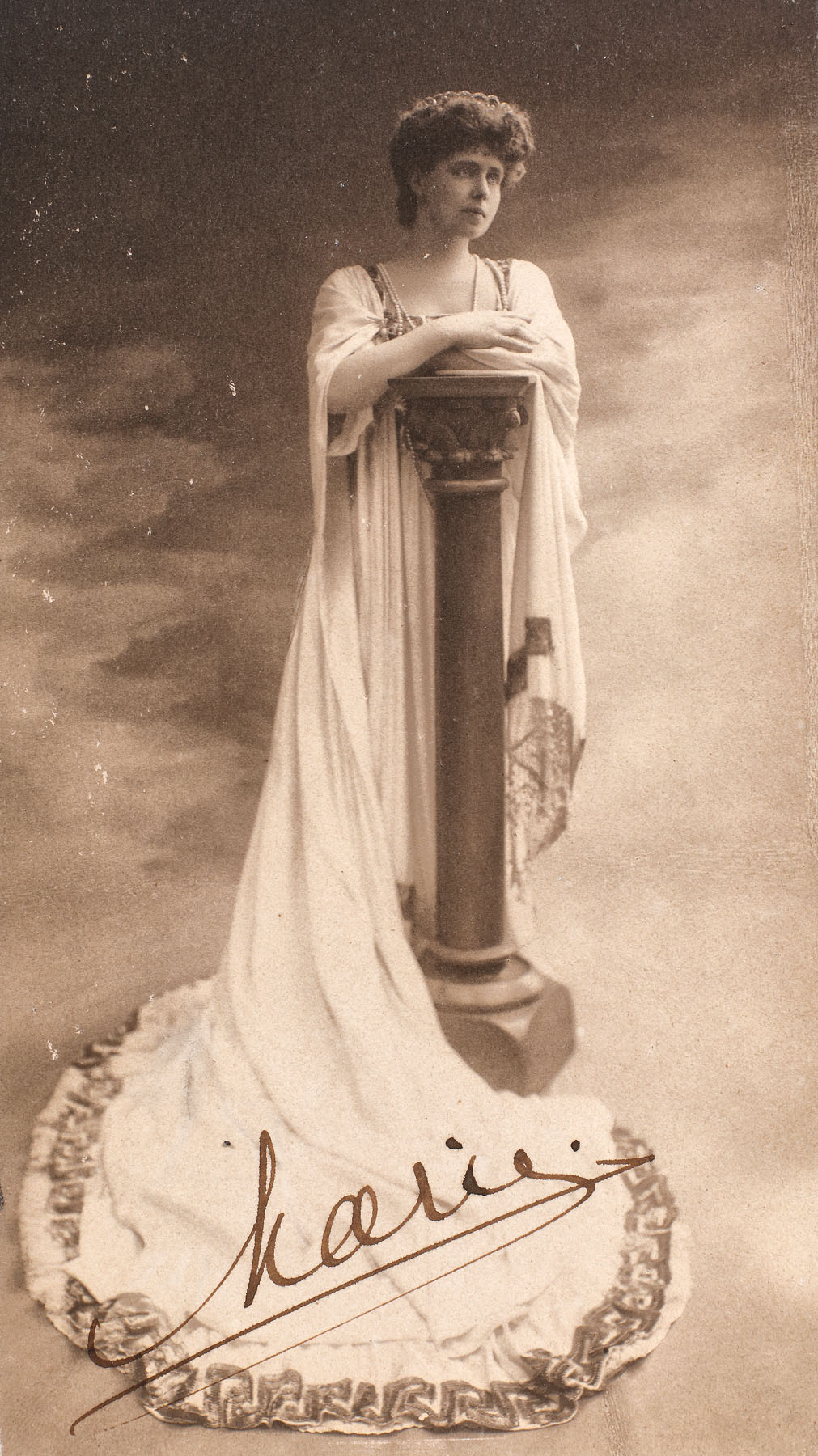 1. Fotografie ilustrând-o pe Principesa Maria într-o postură alegorică, cca. 1910, cu semnătura olografă a principesei, în ramă decorată cu motive Neo-brâncovenești