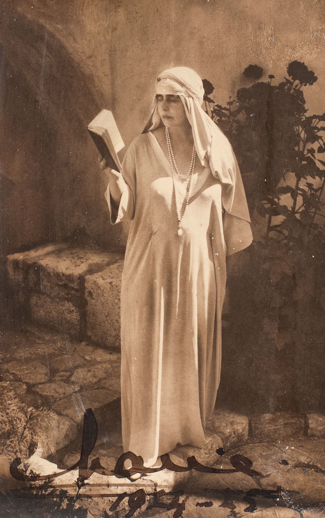 7. Fotografie ilustrând-o pe Regina Maria citind, în grădina de la Balcic, 1924-1925, cu semnătura olografă a reginei, în ramă decorată cu motive Neo-brâncovenești