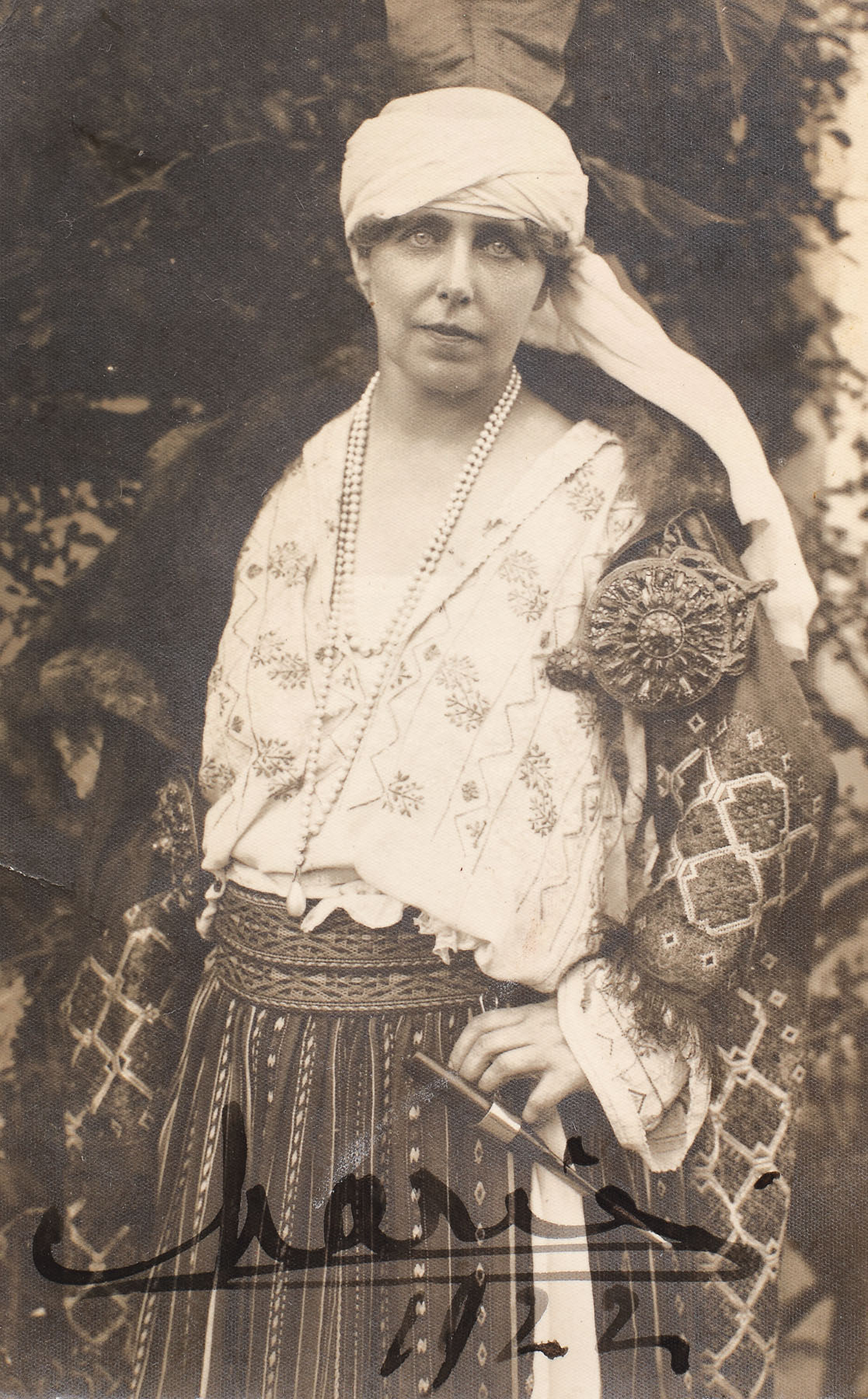 42. Fotografie ilustrând-o pe Regina Maria îmbrăcată în costum tradițional românesc, 1922, cu semnătura olografă a reginei, în ramă decorată cu motive Neo-brâncovenești