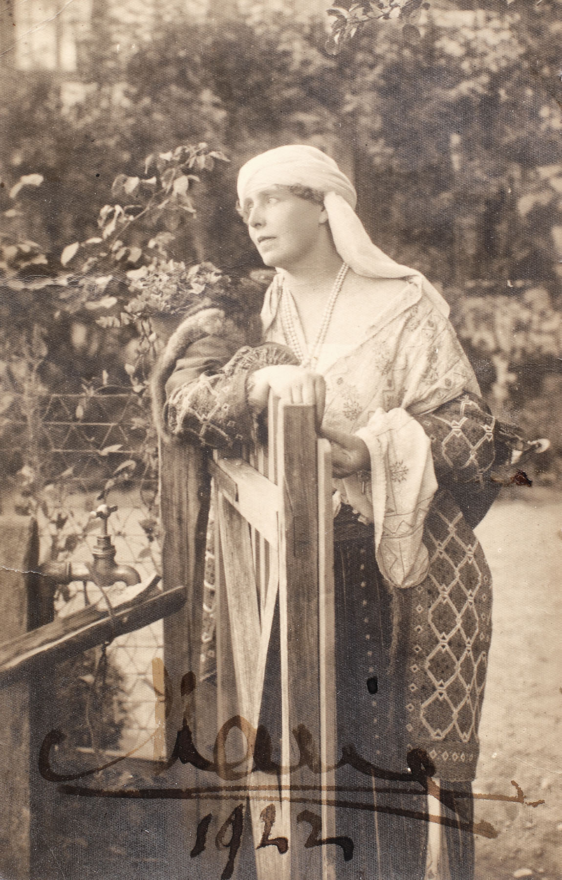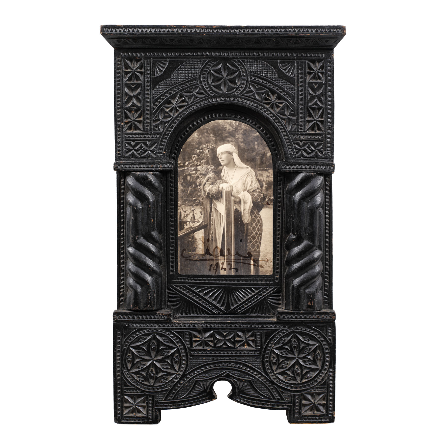 40. Fotografie ilustrând-o pe Regina Maria în costum popular, probabil în grădina Palatului Cotroceni, 1922, cu semnătura olografă a reginei, în ramă decorată cu motive Neo-brâncovenești