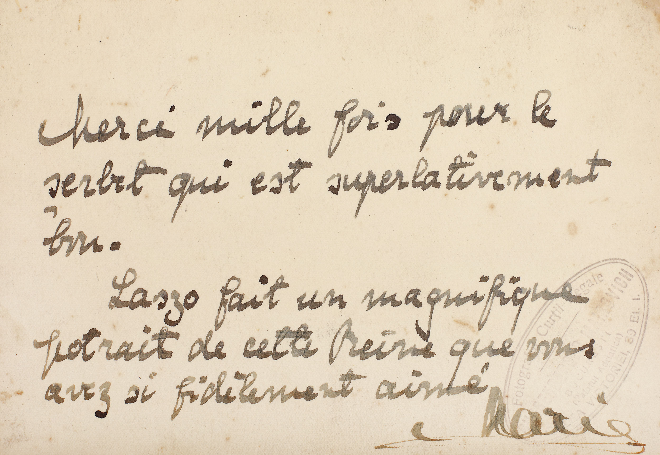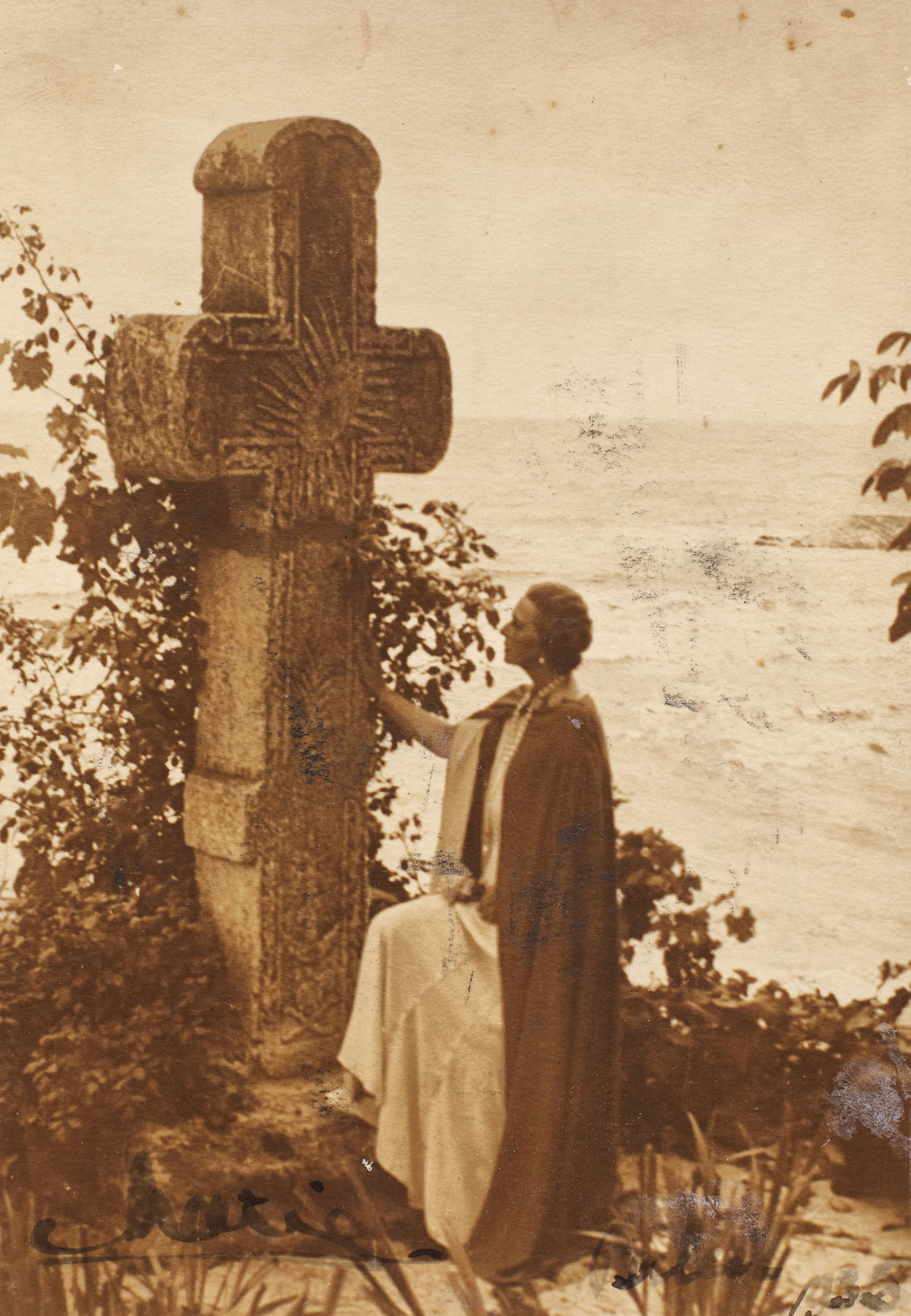 2. Fotografie ilustrând-o pe Regina Maria la Balcic, 1935, cu semnătura olografă a reginei, în ramă decorată cu motive tradiționale românești