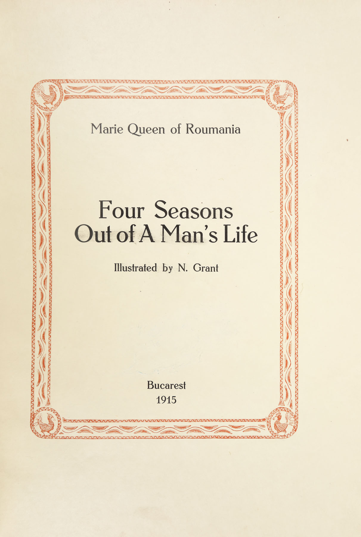 12. ”Patru anotimpuri din viața unui om”, de Regina Maria, engleză, București, 1915, cu ilustrații realizate de pictorul Nicolae Grant, ediție de lux, exemplar numerotat 40, cu semnătura olografă a Reginei Maria