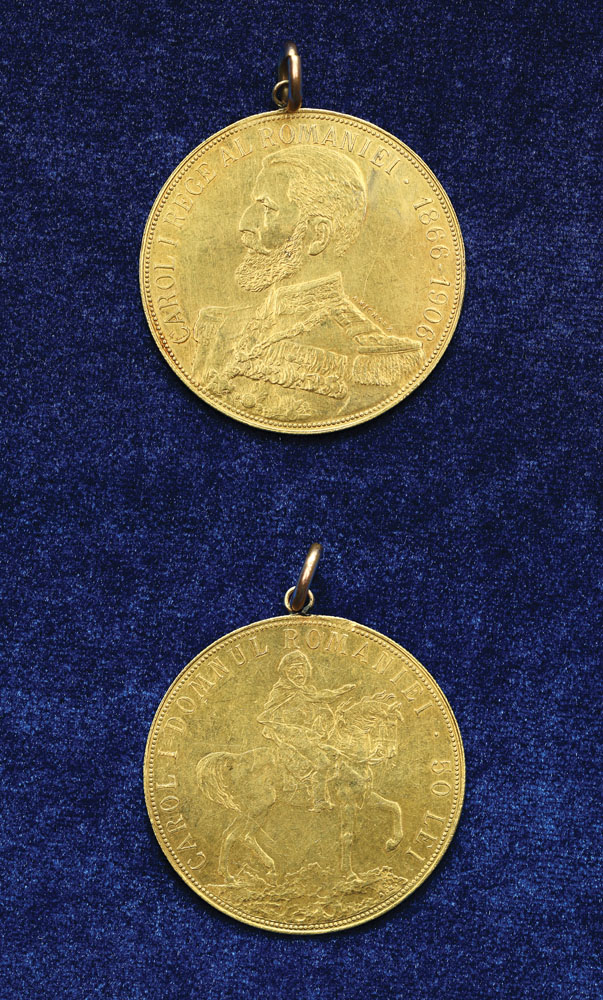 21. Monedă (medalion) jubiliară Carol I, din aur, gravată de Alphonse Michaux, 1906