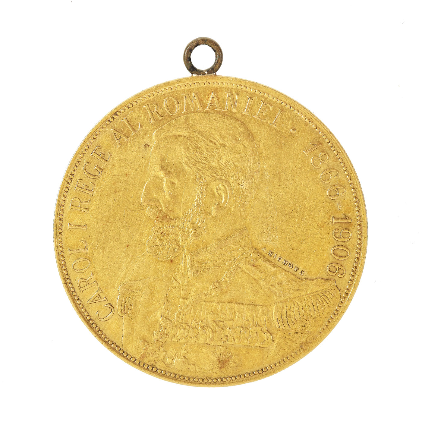 30. Monedă aniversară Carol I, din aur, cu valoarea de 50 de lei, gravor Alphonse Michaux, 1906
