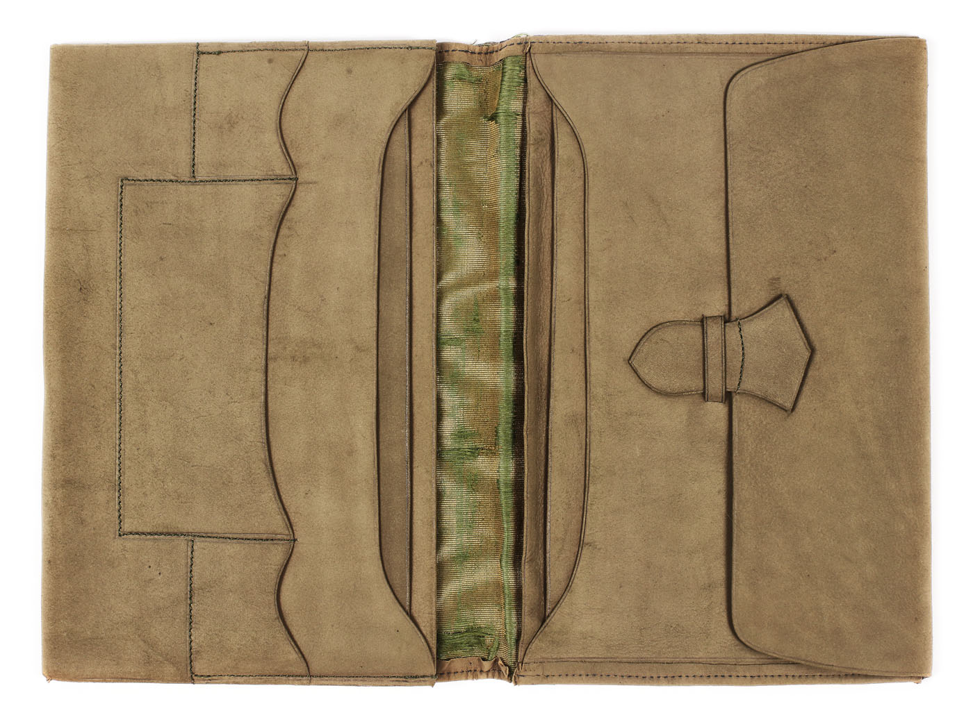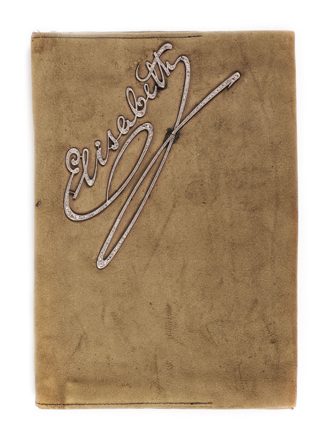 11. Poșetă-plic din piele de căprioară, decorată cu semnătura Reginei Elisabeta, montată în platină bătută cu diamante
