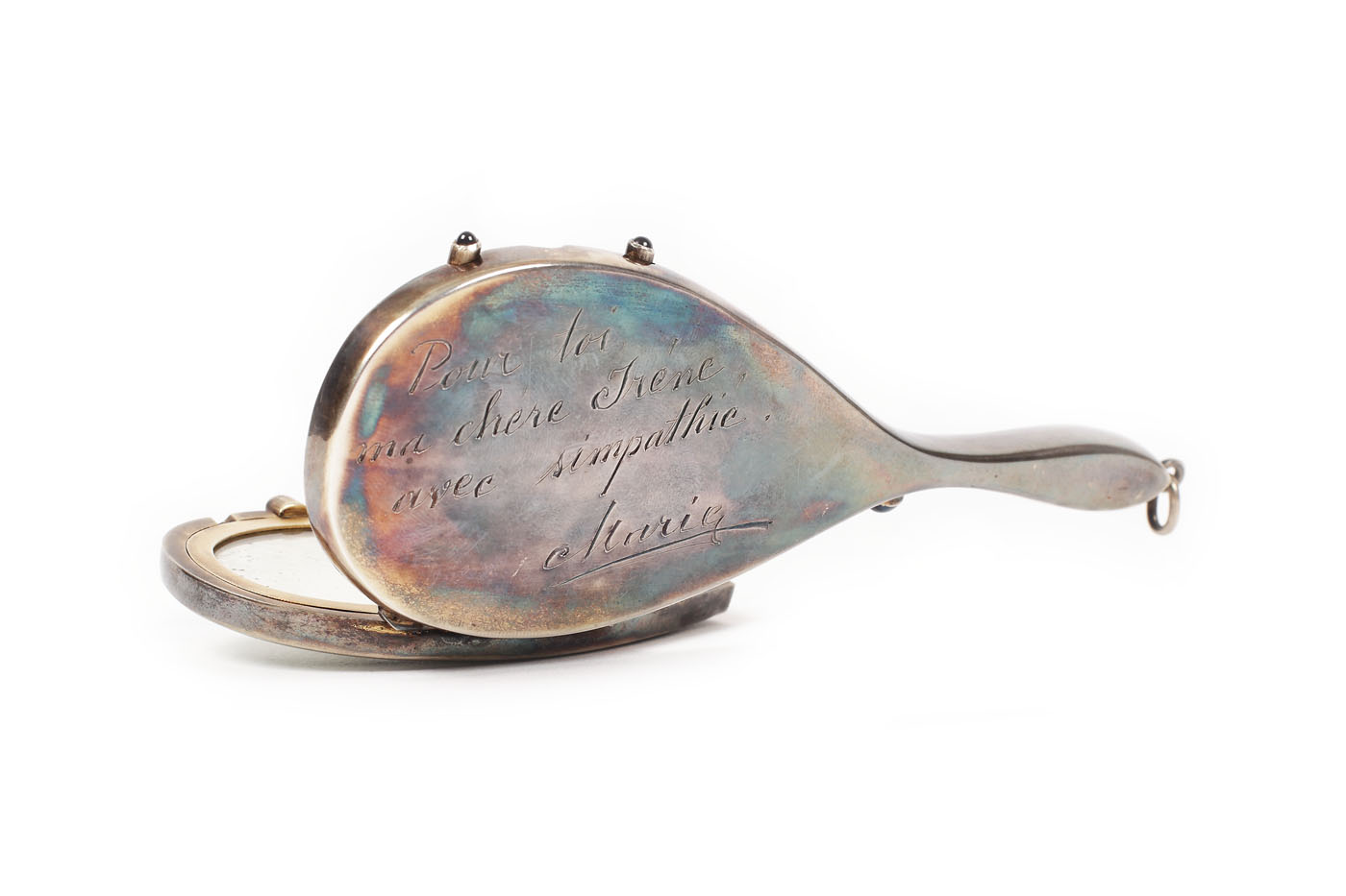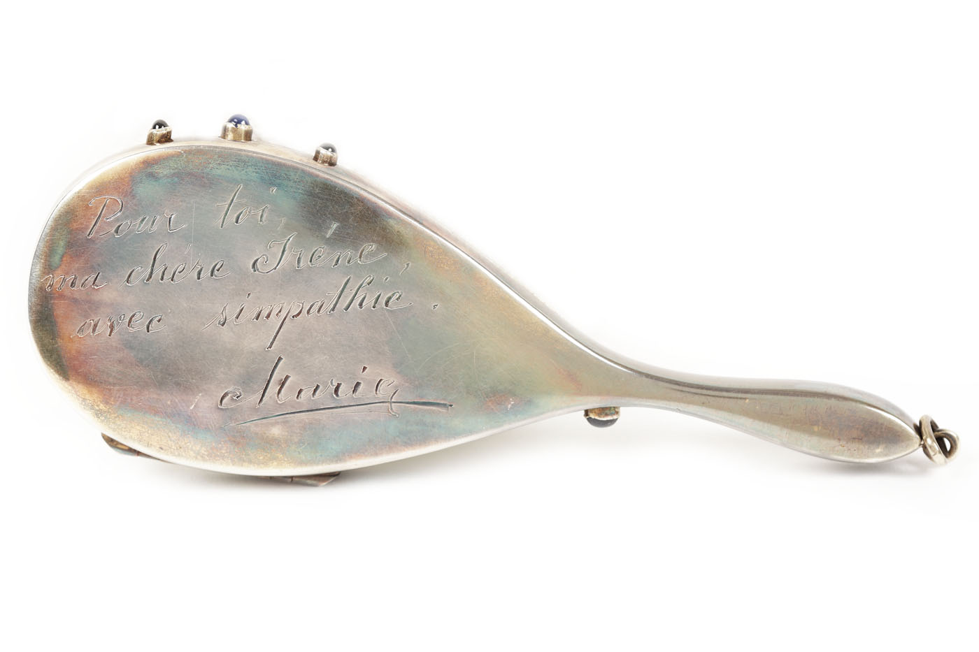 9. Pudrieră de bal, din argint aurit și email, în cutia originală, a aparținut Irinei Procopiu, doamnă de onoare a Reginei Maria, inscripționată cu dedicația Reginei Maria pentru Irina ("Pur toi, ma chère Irène, avec simpathiè. Marie"), cca. 1920