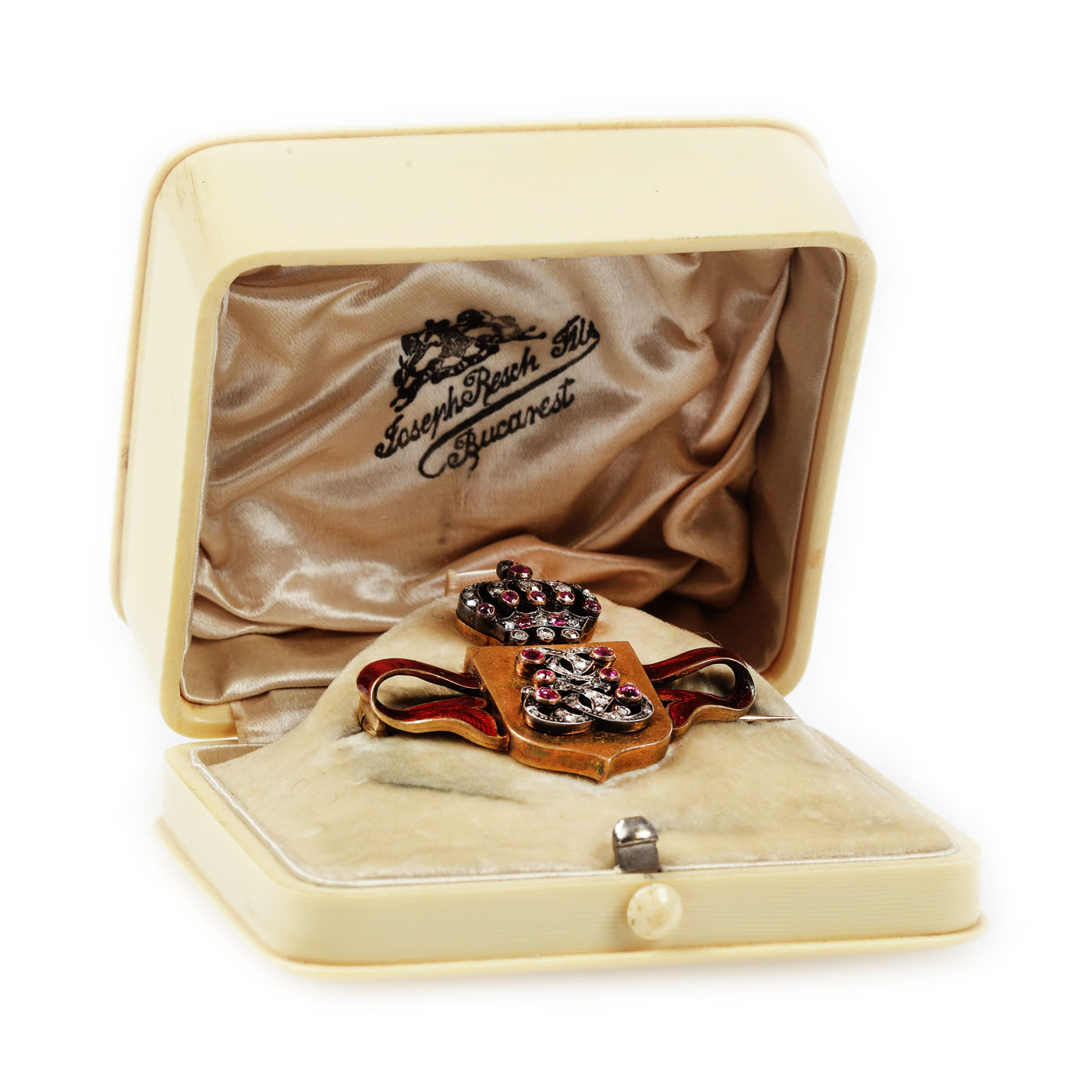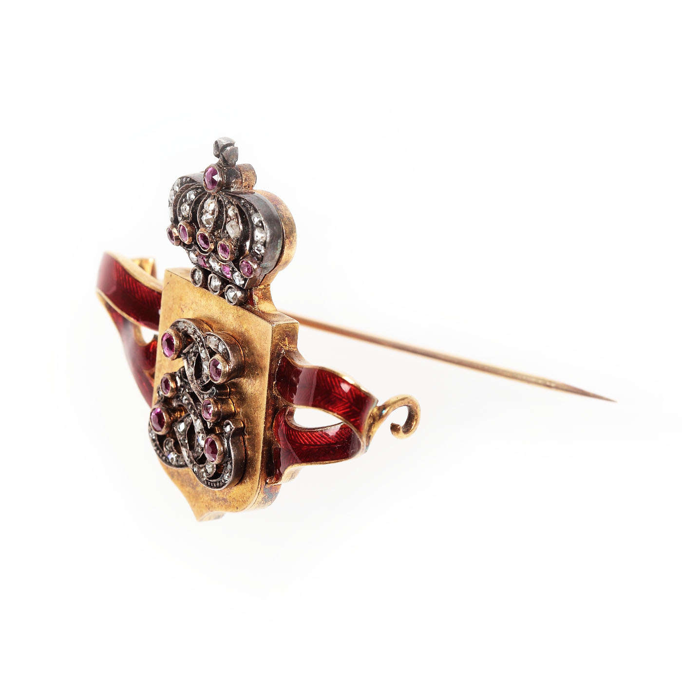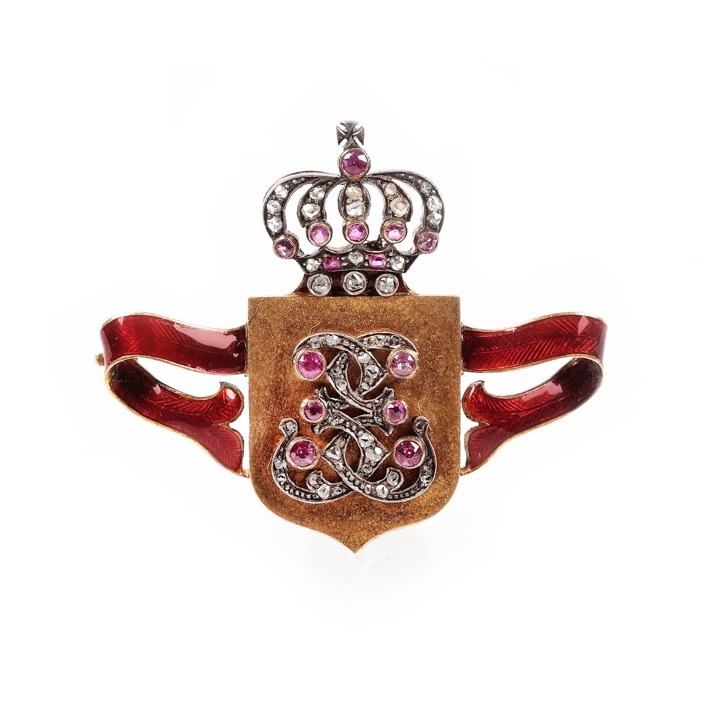 10. Rară broșă din aur Joseph Resch, decorată cu cifrul regal, diamante, safire roz și email, cca. 1900, piesă de colecție