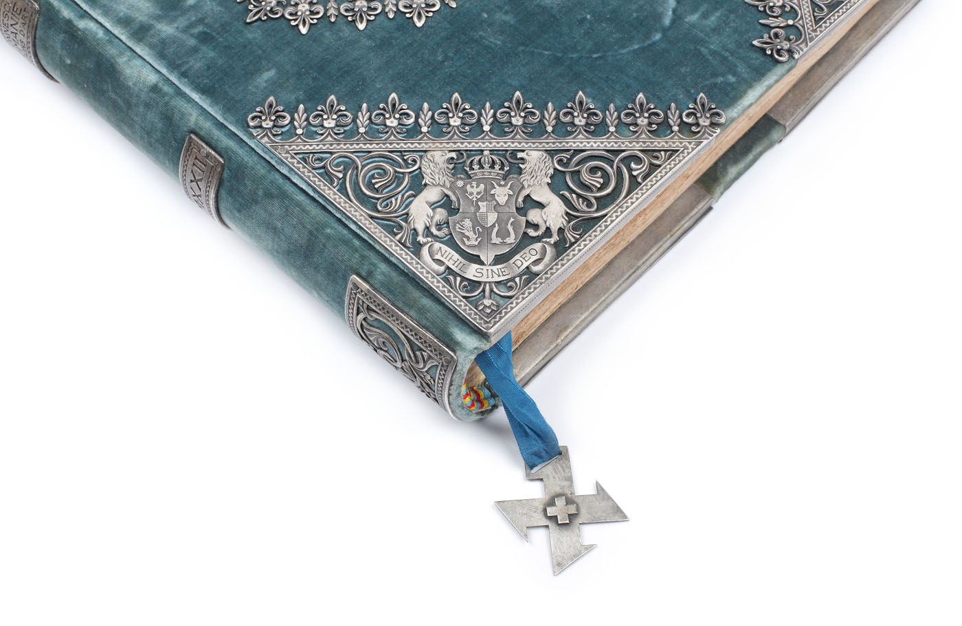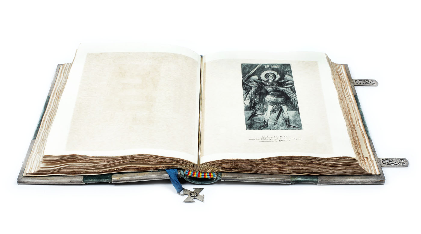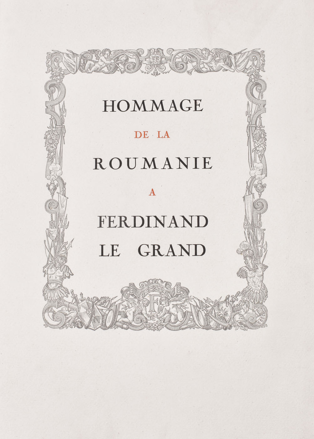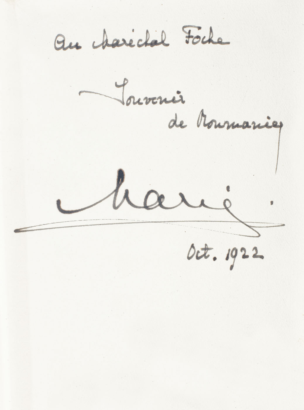 La ceremonia încoronării de la Alba Iulia, din 15 octombrie 1922, a participat şi mareşalul Foch, ca reprezentant al Franţei, alături de generalul Henry Berthelot. Cu acea ocazie, Regina Maria a dăruit mareşalului Foch acest album. gest simbolic care evidenţia şi recunostinta pentru sprijinul acordat de României în Primul Război Mondial. Ferecătura a fost realizată de meşterul Marius Veaugeois.