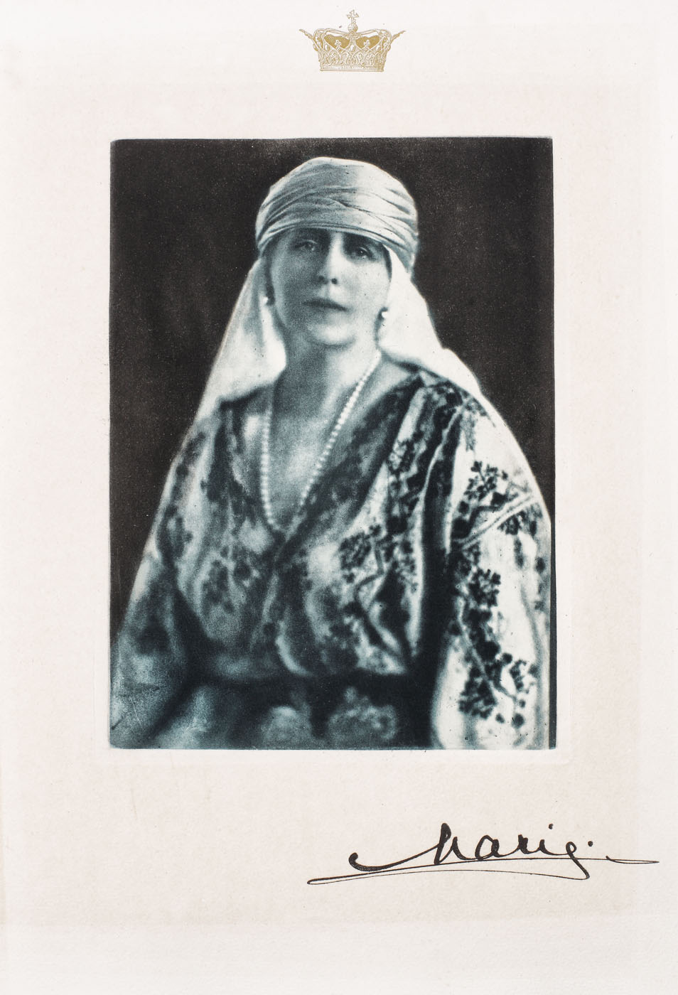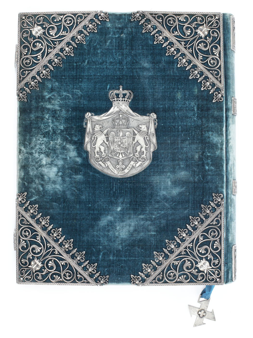 14. "România", carte de colecţie,"Omagiul României lui Ferdinand cel Mare", cu ferecătură din argint, tipărit pe hârtie manuală, cu dedicația Reginei Maria către mareșalul Ferdinand Foch, Paris, 1922