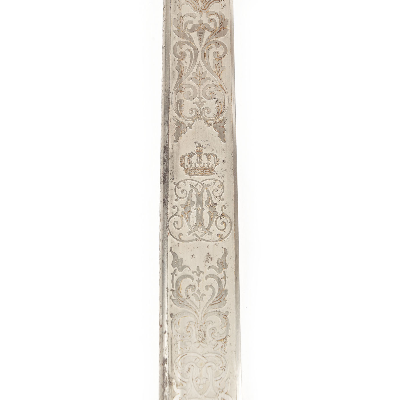 1. Sabie de paradă, de ofițer de infanterie, cu teacă, purtând cifrul Regelui Carol I
