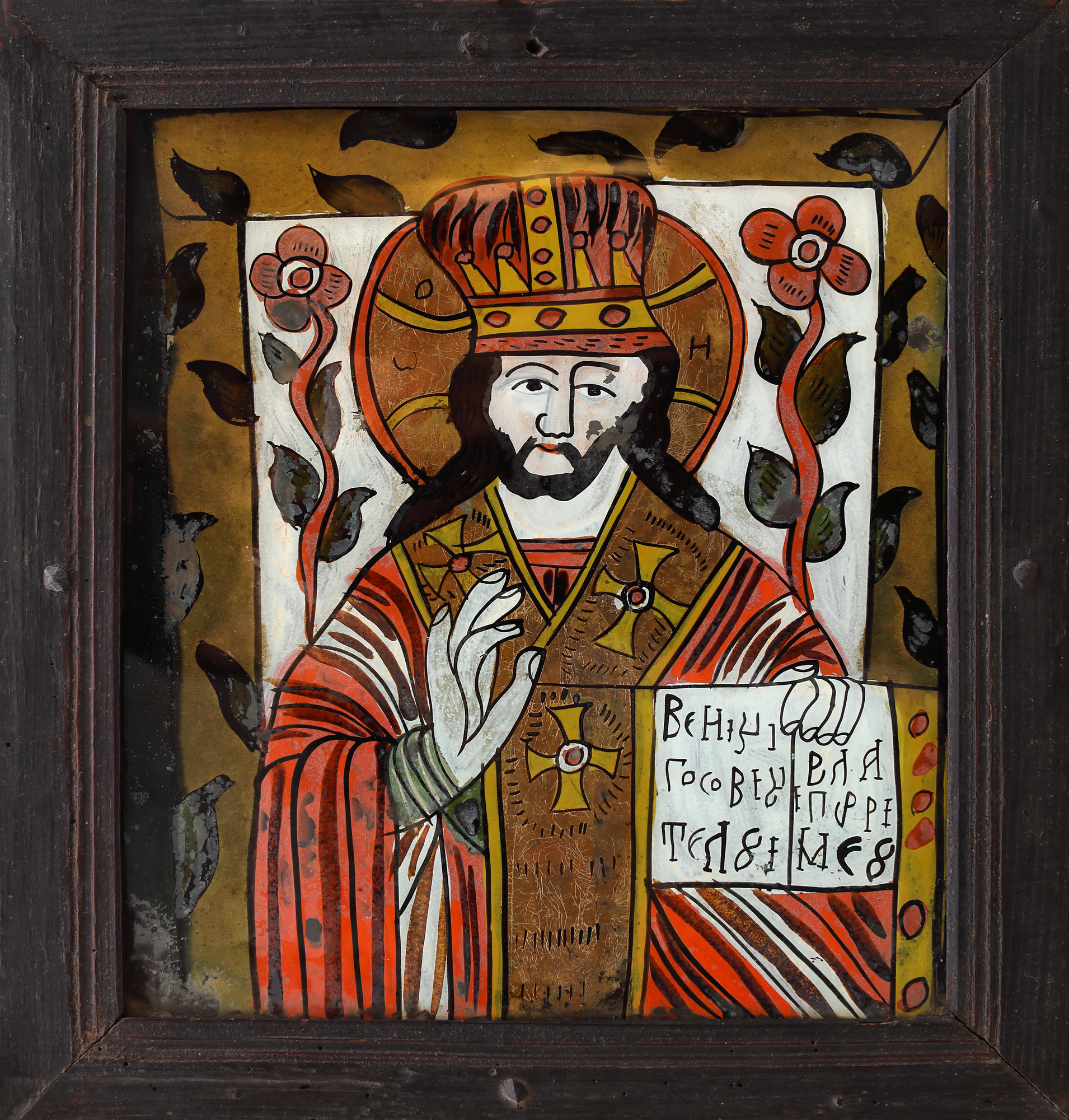 40. Icoană pe glajă, ”Iisus Hristos Pantocrator”, atelier din Nicula, către mijlocul sec. XIX, piesă foarte rară, de colecție, provine din colecția artistei Sanda Șaramat