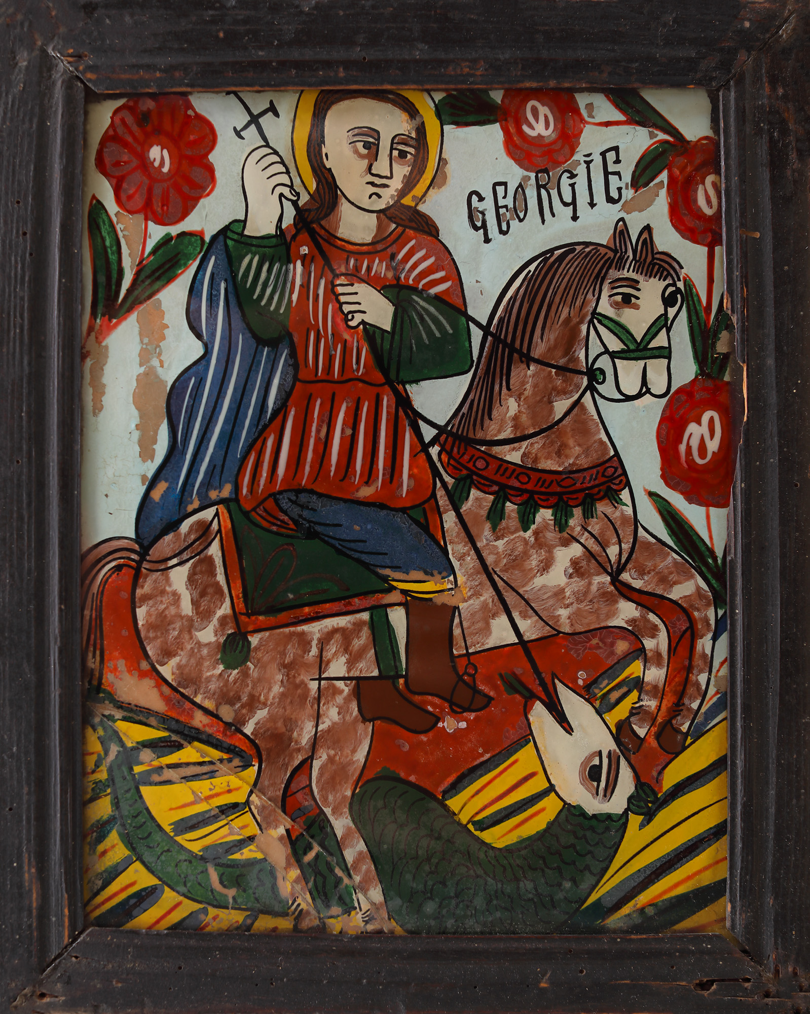 51. Icoană pe glajă, "Sfântul Gheorghe omorând balaurul", atelier din Gherla, sfârșitul sec. XIX, provine din colecția artistei Sanda Șaramat