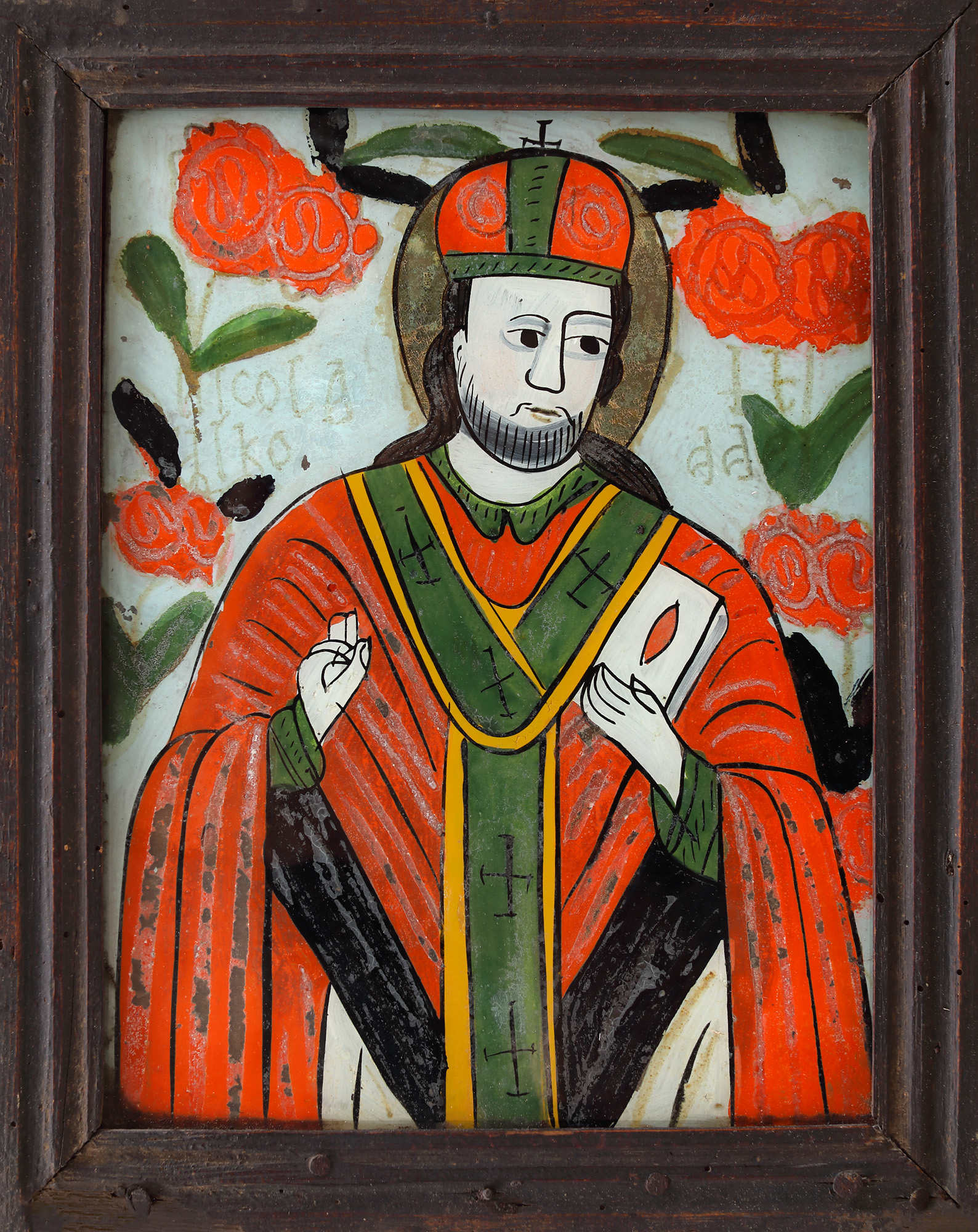 42. Icoană pe glajă, ”Sfântul Nicolae”, atelier din Gherla, a doua jumătate a sec. XIX, provine din colecția artistei Sanda Șaramat