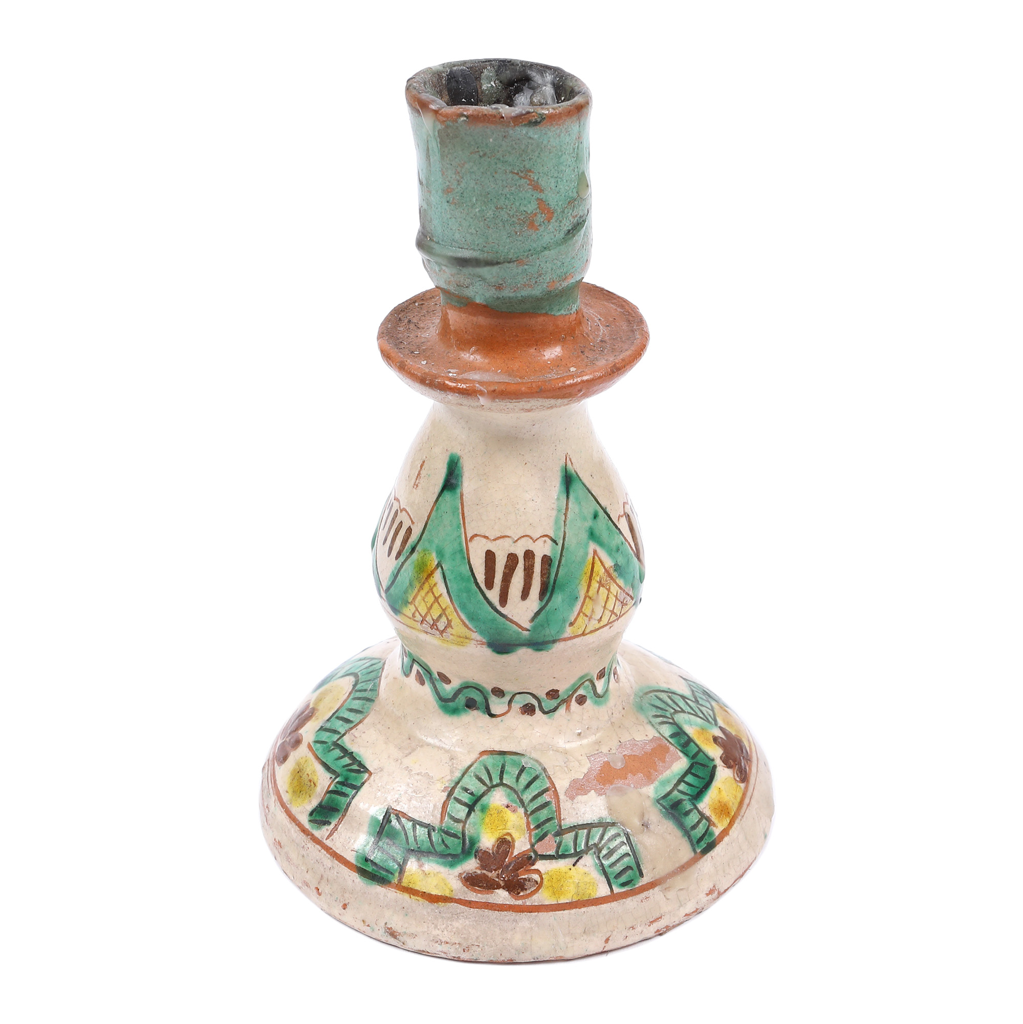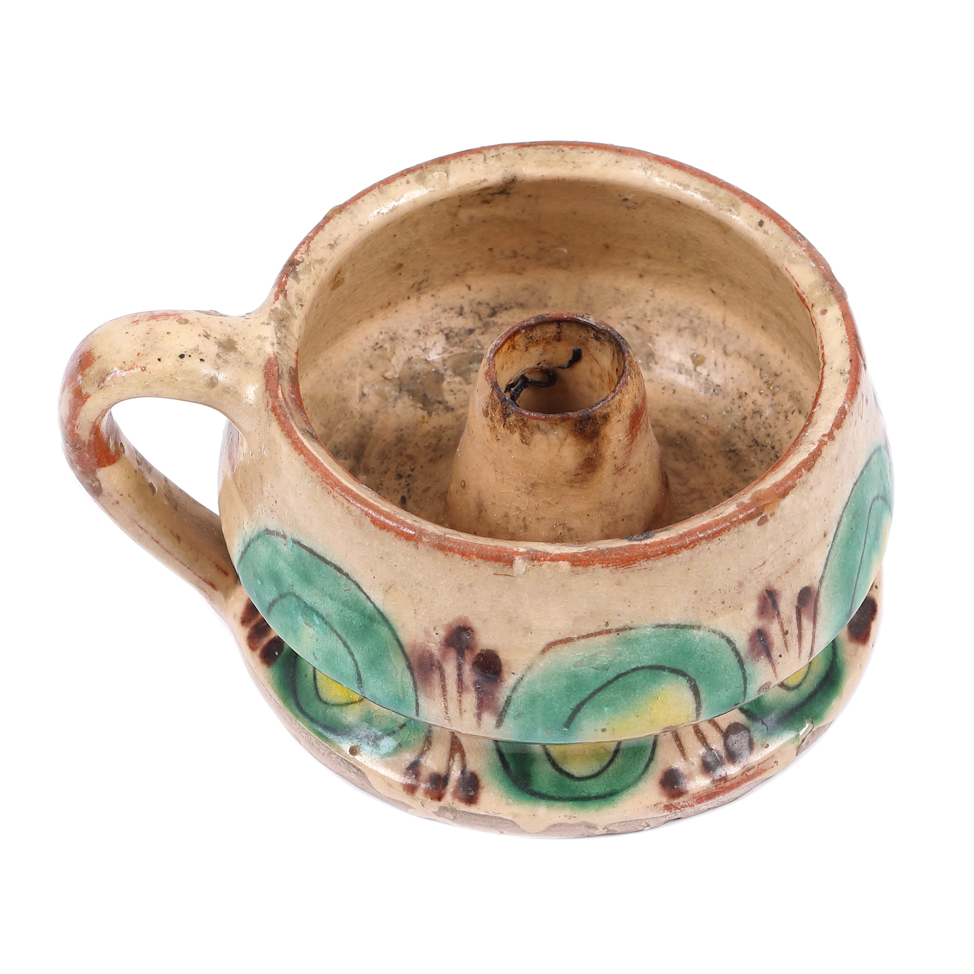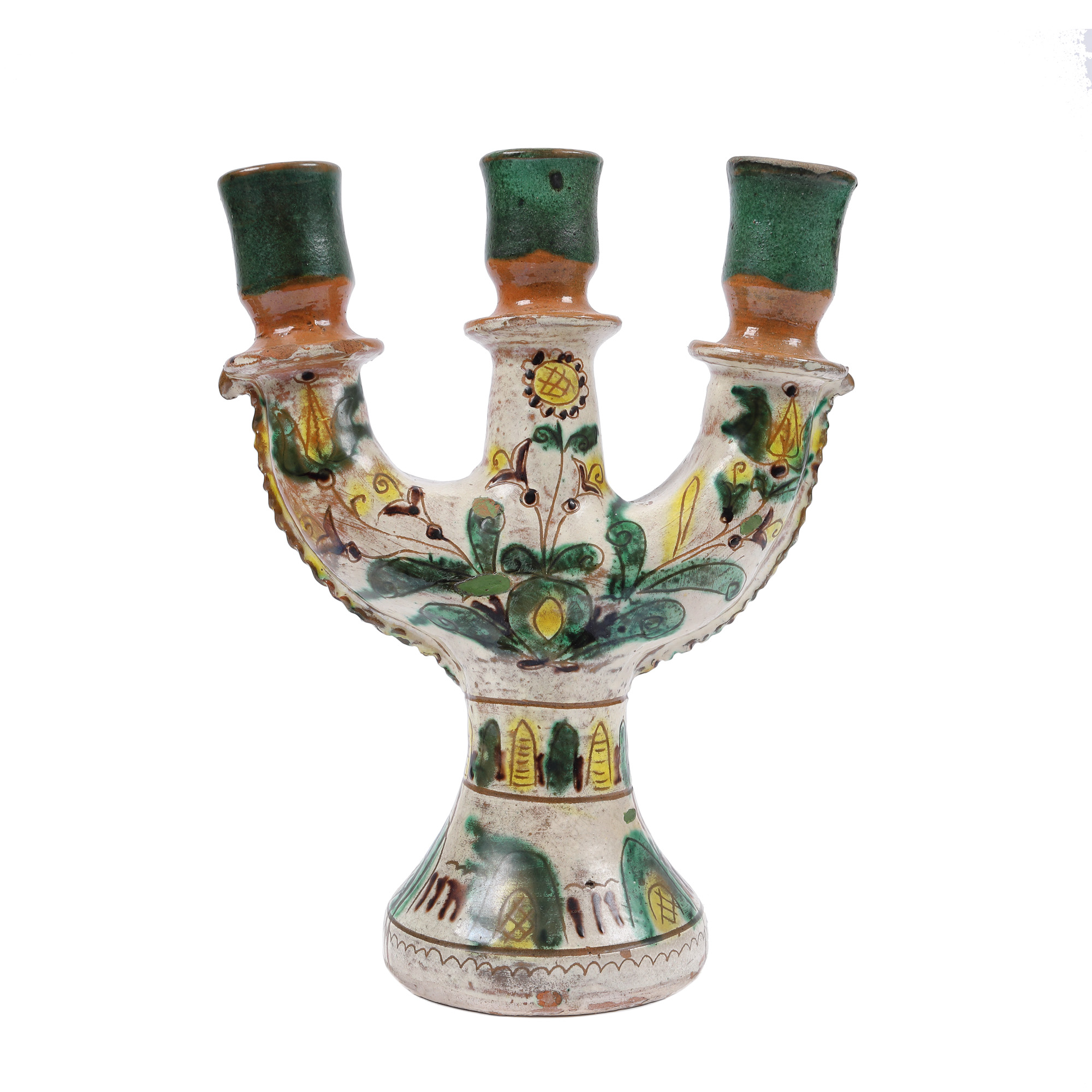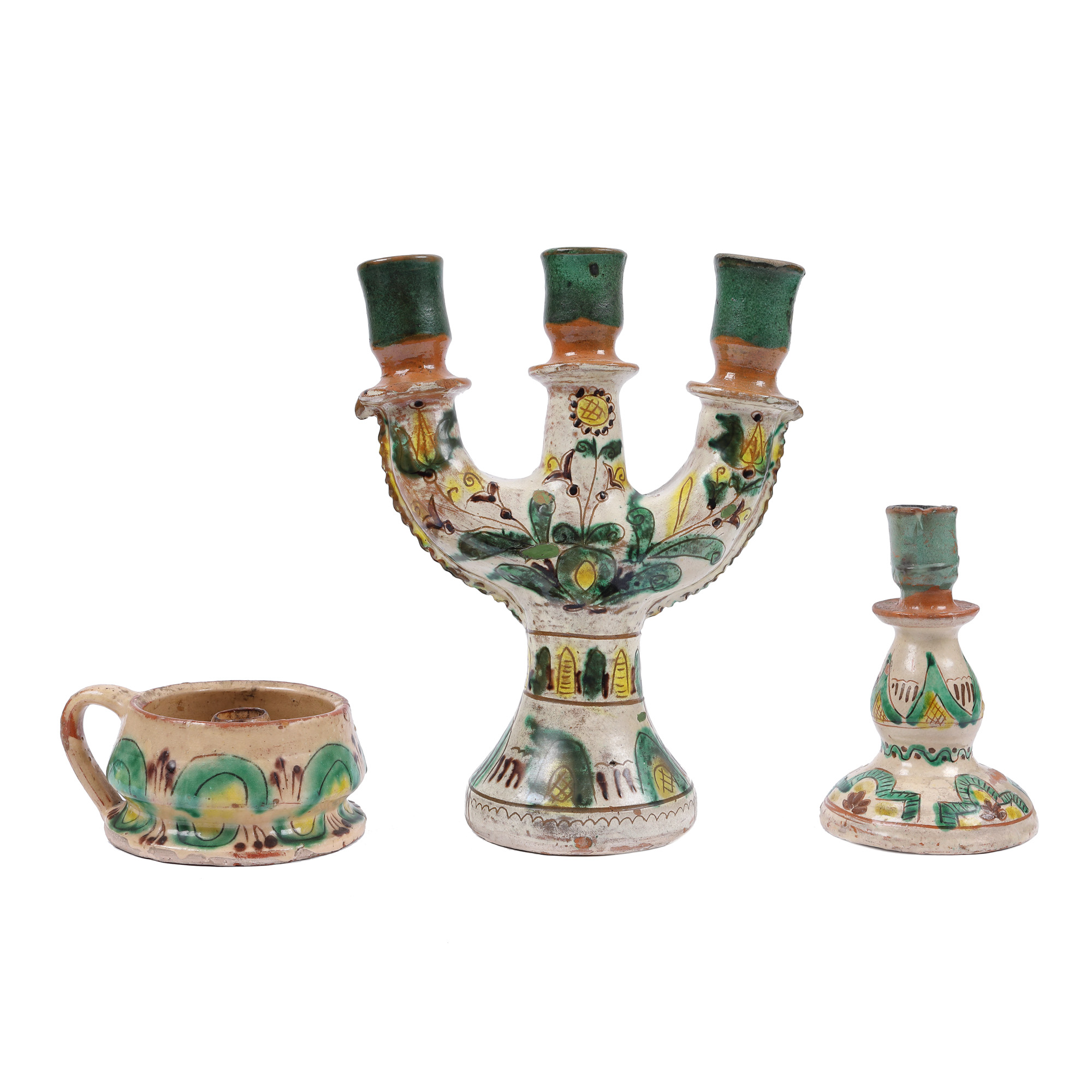 37. Lot format din trei sfeșnice tip Kuty, decorate cu floarea soarelui și lalele, dintre care unul semnat Colibaba, Rădăuți, prima jumătate a sec. XX, provine din colecția artistei Sanda Șaramat