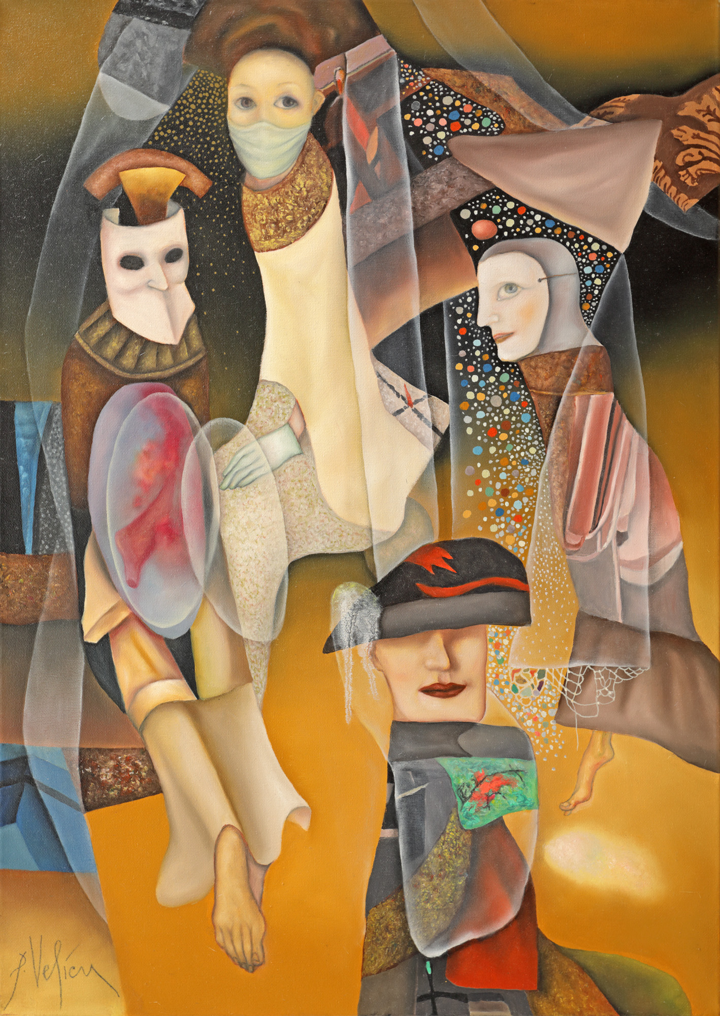semnat stânga jos, în creion, "P. Velicu"; semnat, datat, intitulat și localizat pe verso, cu negru, "Petre Velicu, Carnaval, 2020, Paris"