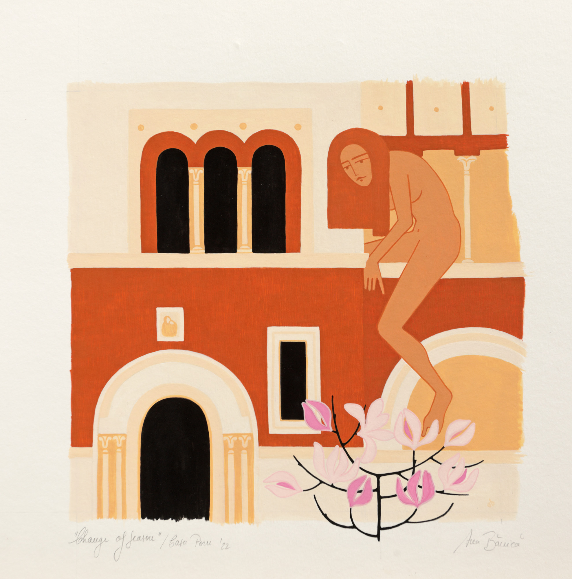 semnat dreapta jos, cu oranj, "ab"; semnat, datat și intitulat pe verso, în creion, "Ana Bănică, Change of Season, 2022"