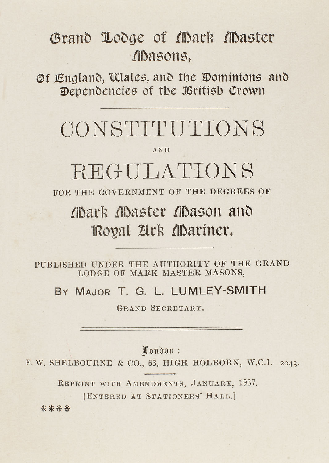 37. ”Constituția și regulamentul gradelor din ritul de York”, de Marele Secretar T.G.L. Lumley-Smith, engleză, Londra, 1937