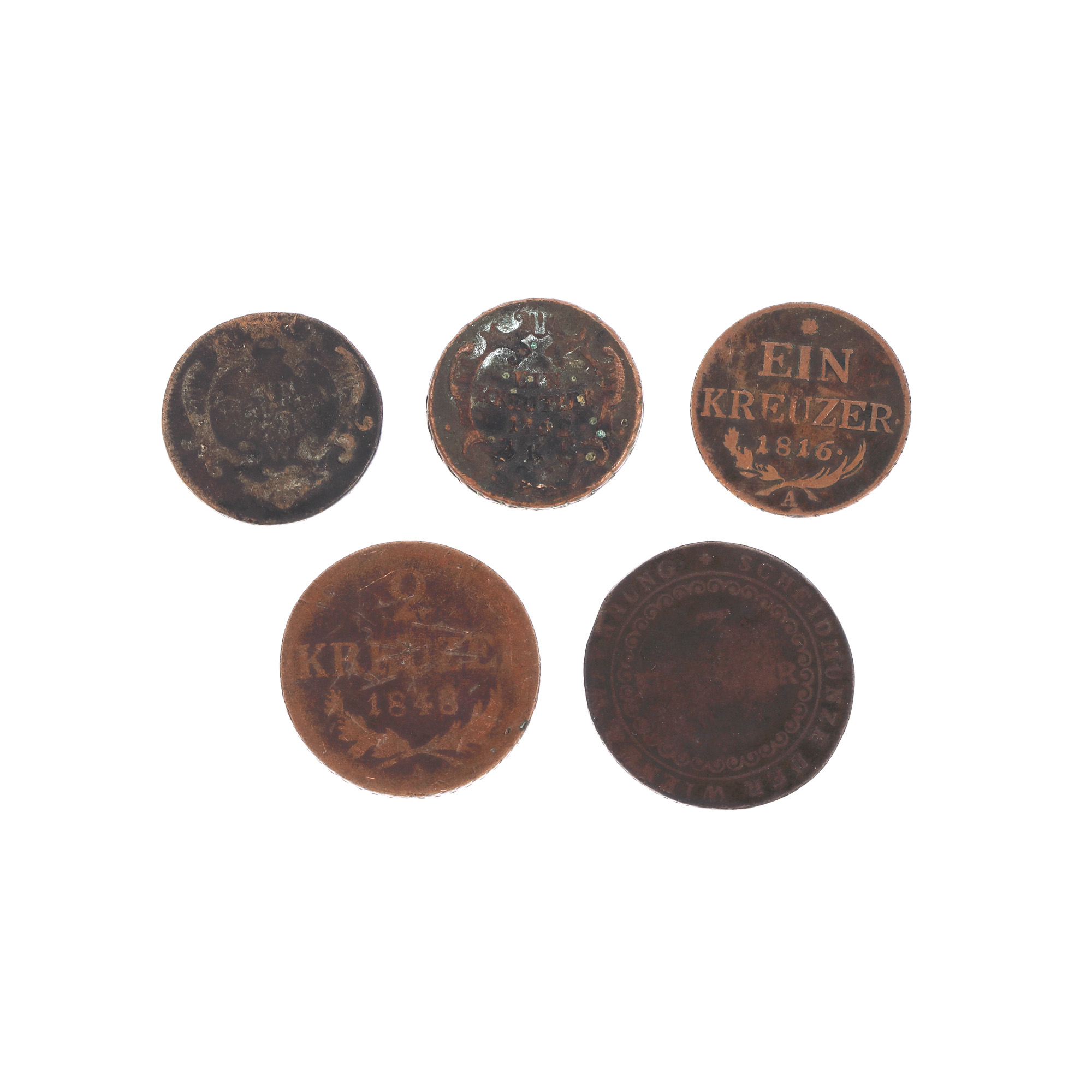 10. Lot format din cinci crăițari, 3 Kreuzer 1812, 2 Kreuzer 1848, 1 Kreuzer 1761, 1762, 1816
