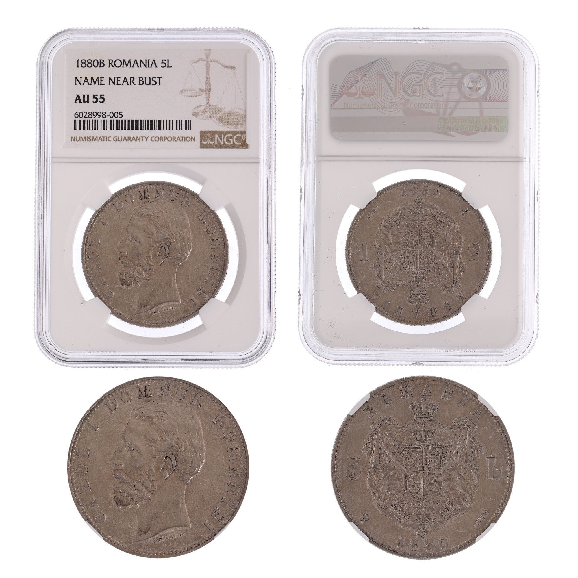 54. Moneda 5 Lei 1880B, AU 55, cu semnătura gravorului sub gât, argint
