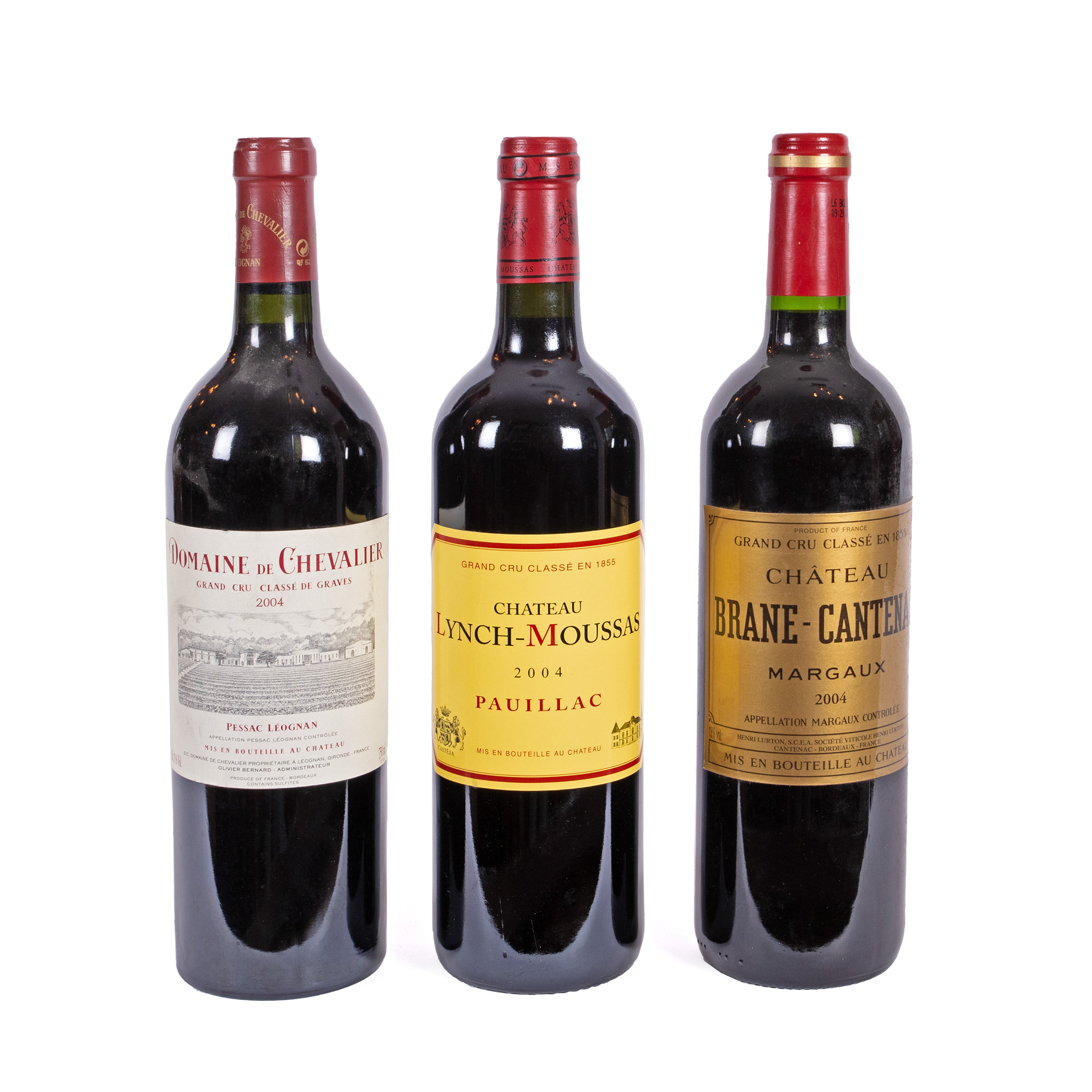 Château Brane-Cantenac, Margaux, 2004, 1st x 0.75l Château Lynch Moussas, Pauillac, 2004, 4st x 0.75l Domaine de Chevalier Rouge, Pessac-Léognan, 2004, 1st x 0.75l