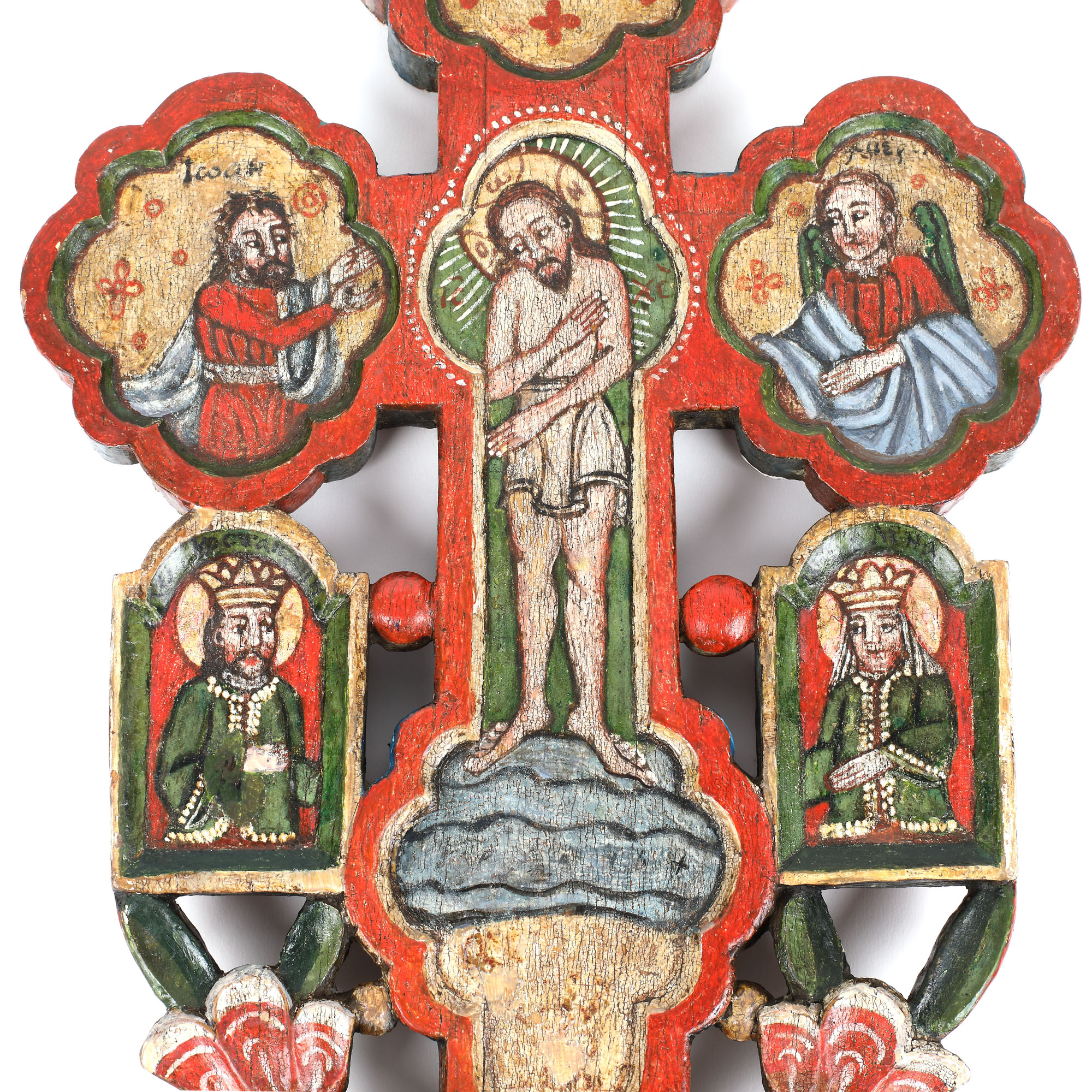 Capetele crucii sunt polilobate, pe o față este pictată scena ”Răstignirii Domnului”, de o parte și de alta sunt redați bust Maica Domnului și Sfântul Ioan Evanghelistul, la baza crucii un decor vegetal sculptat, ajurat; pe partea cealaltă este pictată scena ”Botezului Domnului”, de o parte și de alta sunt redați bust, Sfântul Ioan Botezatorul și un înger, flancat de Sfinții Împărați Constantin și Elena.