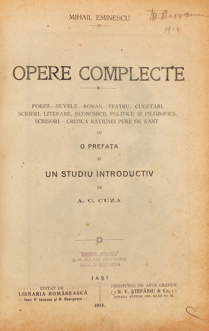 214. Mihai Eminescu, "Opere complecte", ediția A. C. Cuza, 1914, ediție interzisă în 1948