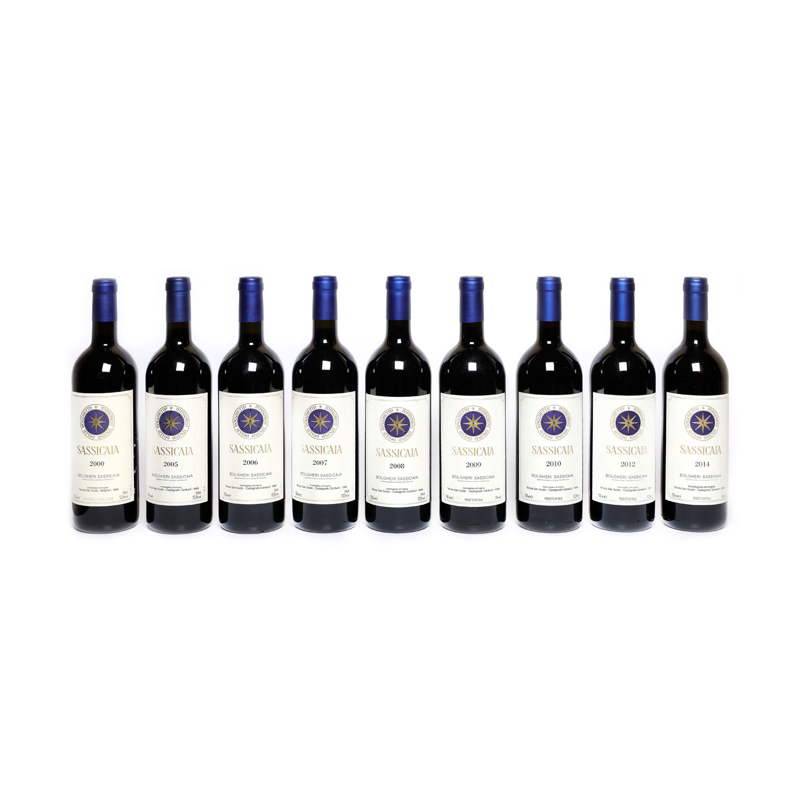 238. Verticală Sassicaia, 2000/2005/2006/2007/2008/2009/2010/2012/2014, 9 st x 75 cl