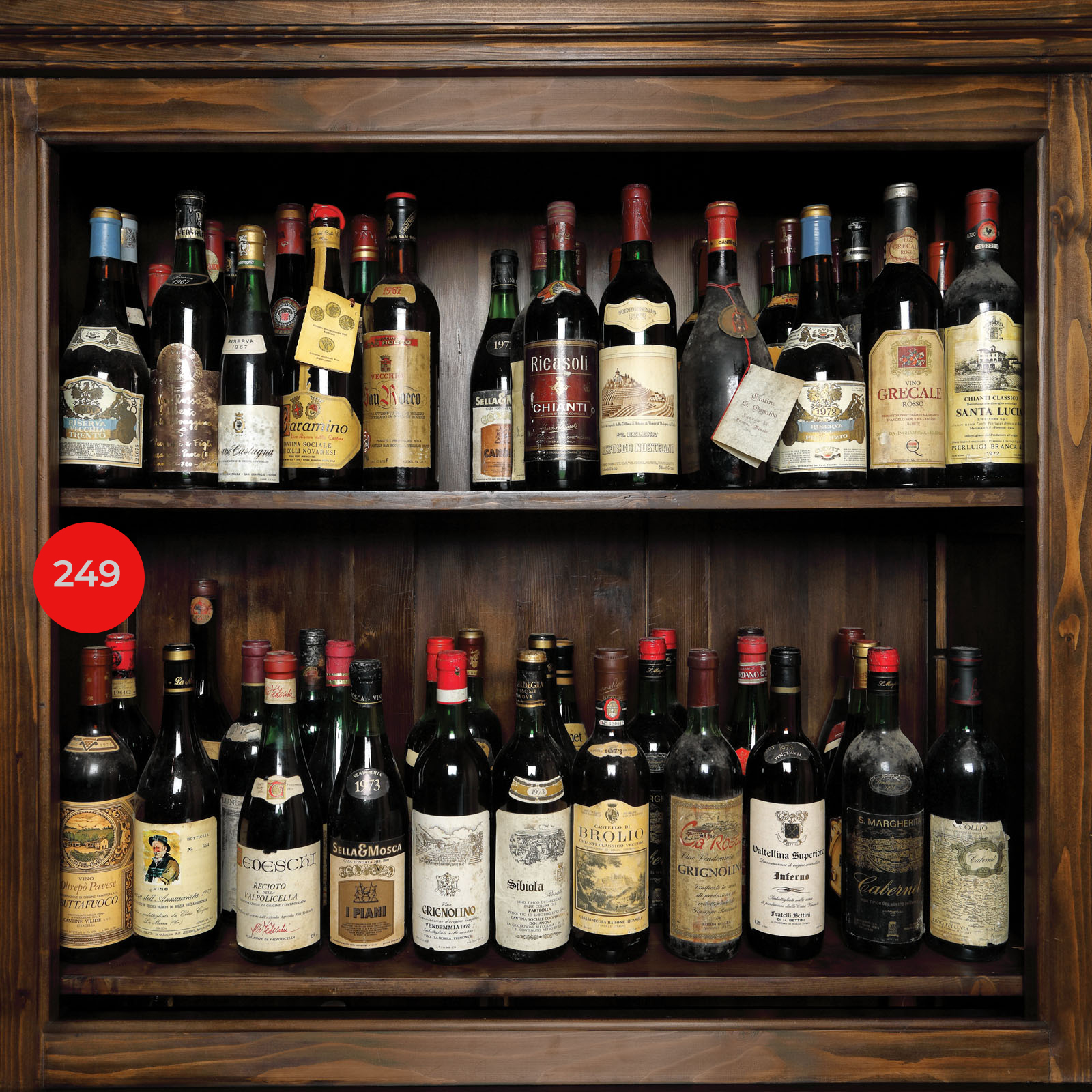 249. Colecție de vinuri italienești: Giordano; Ca’Rossa; Castello di Bralio; Tedeschi; Santa Margherita, 1973, 26 st x 72 cl / 1 st x 150 cl