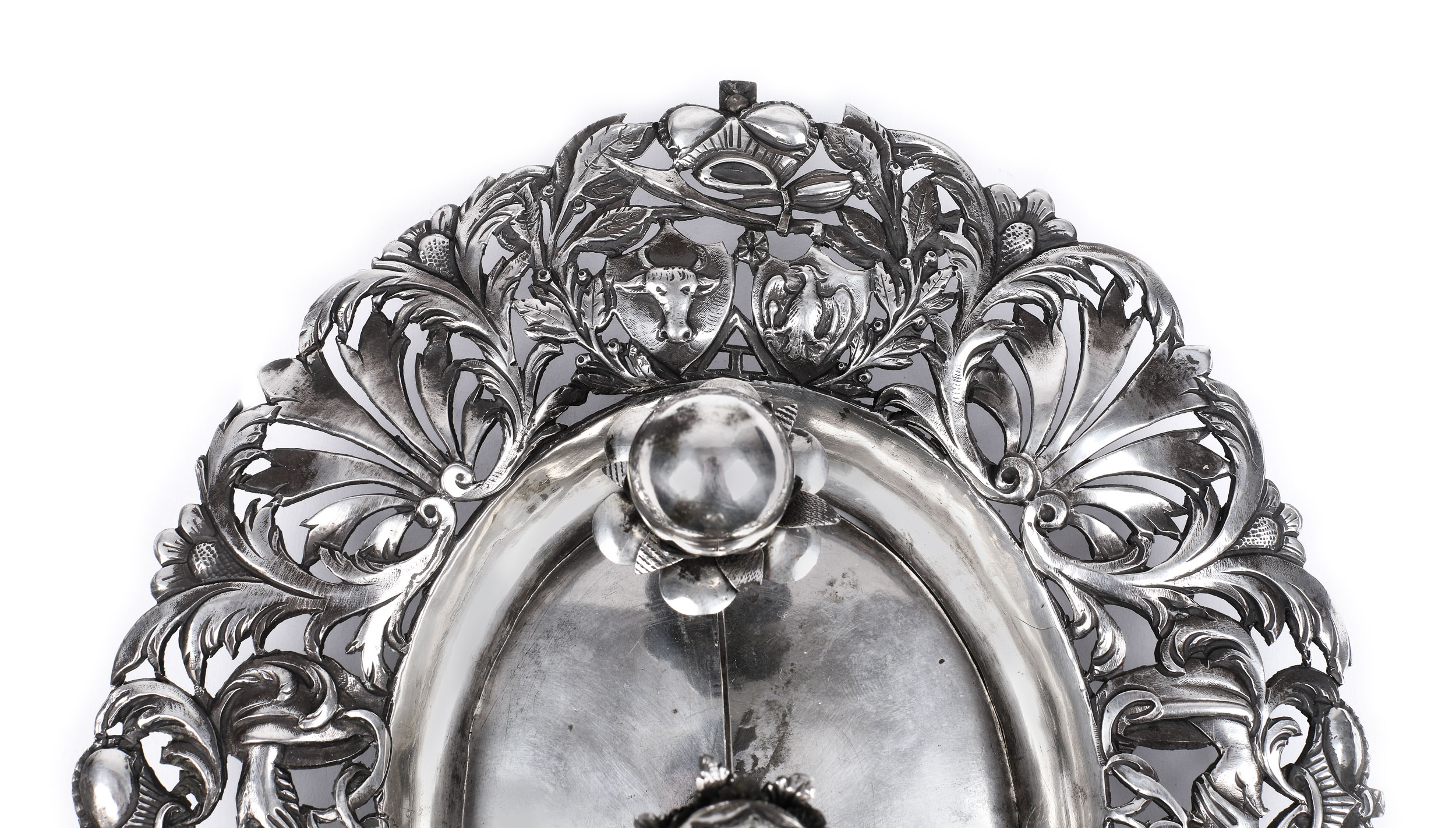 5. Platou omagial al Unirii Principatelor Române din anul 1859, din argint, ornat cu simbolurile stemei Țării Românești și ale Moldovei, piesă rară, provine din colecţia Lucrezia și Ion Pacea
