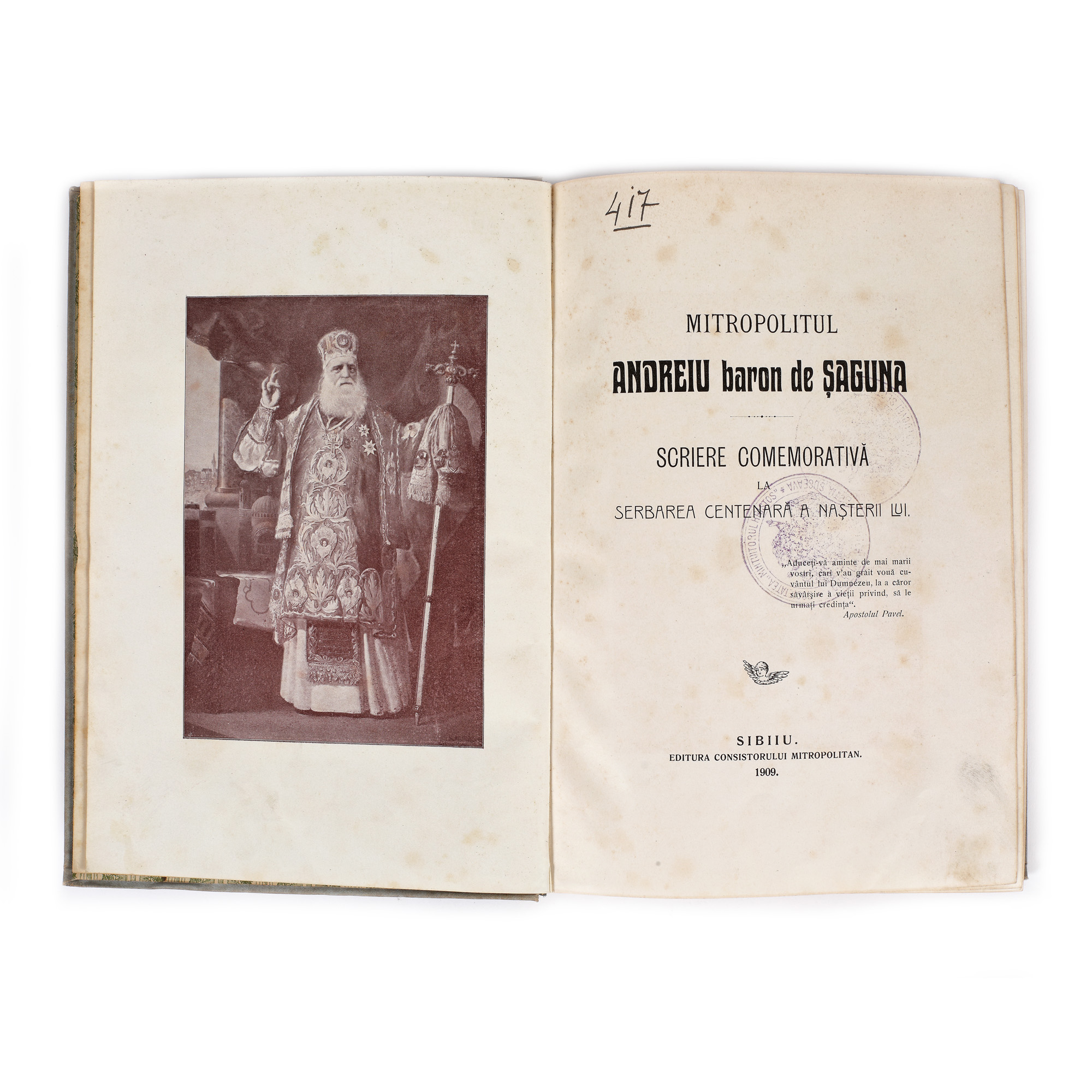 20. "Mitropolitul Andreiu baron de Șaguna", Sibiu, 1909, biografie a Mitropolitului românilor din Transilvania, cel ce a avut un rol esențial în introducerea învățământului în limba română în comunitățile din Transilvania sub ocupație austro-ungară