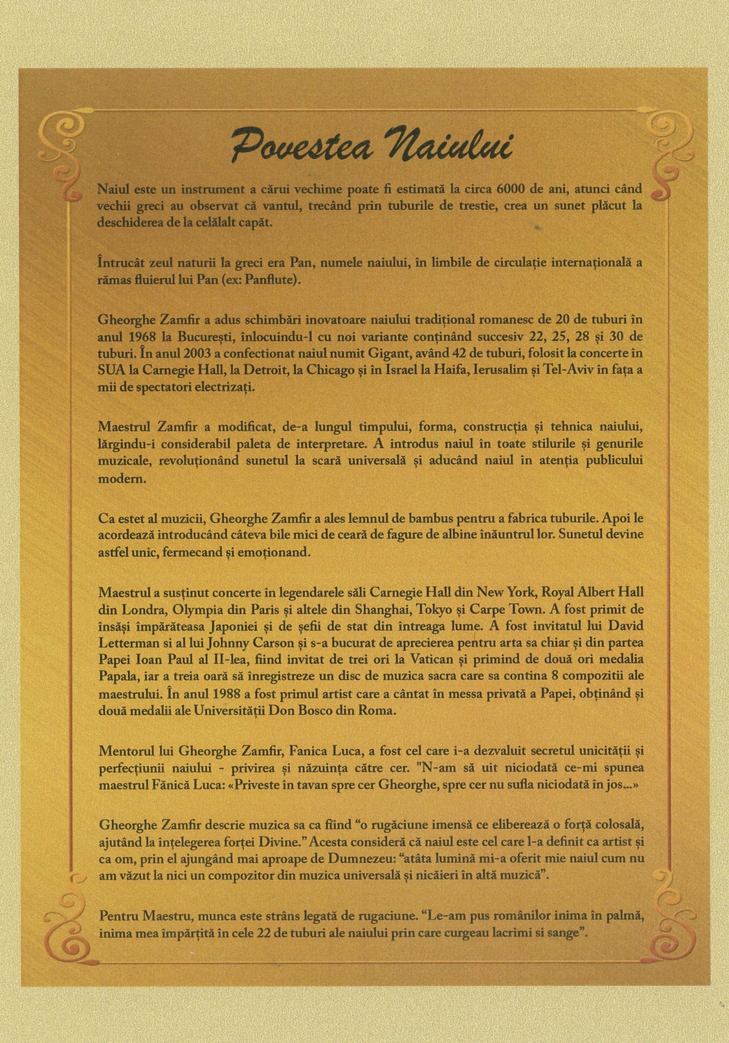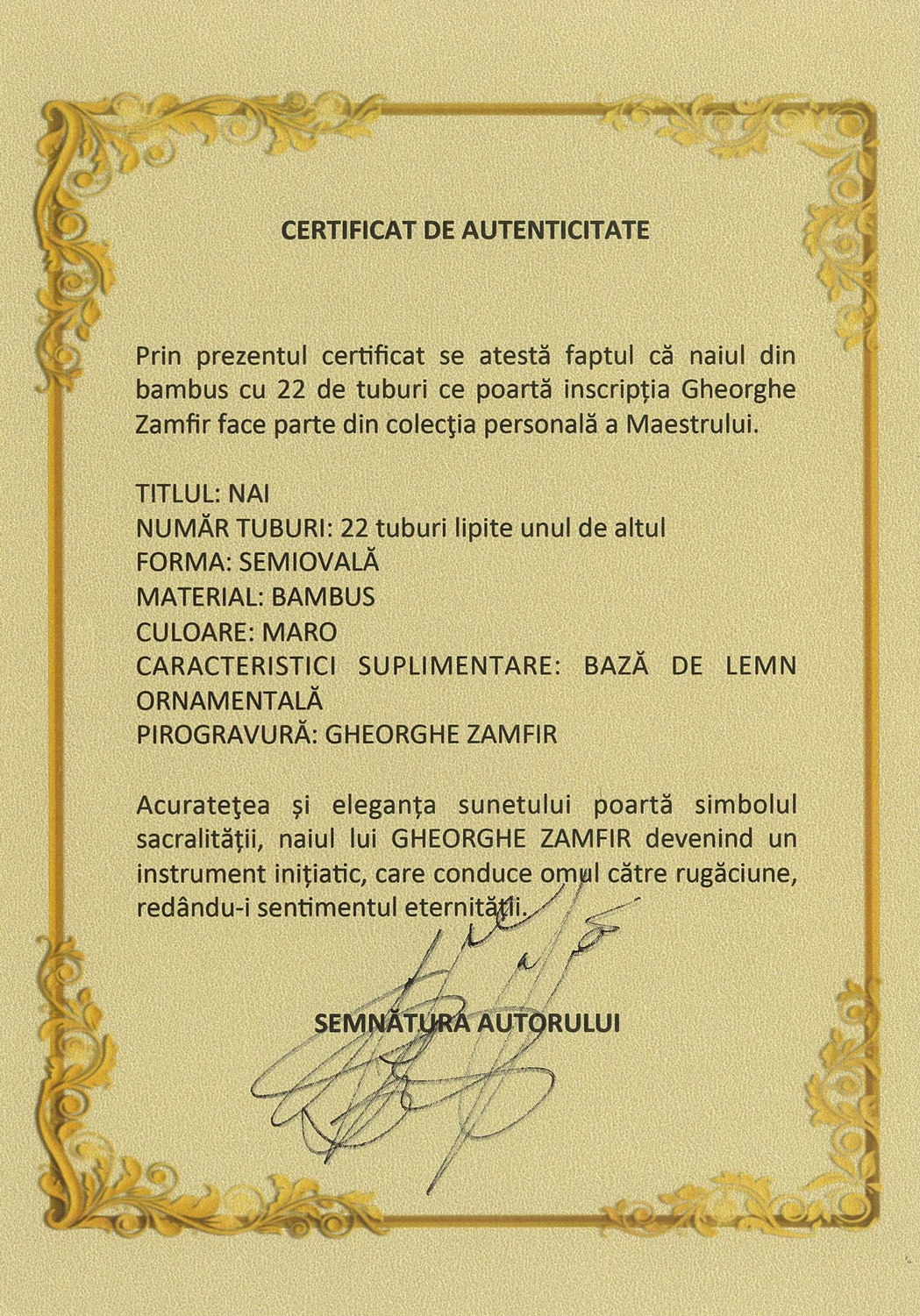 37PC. Naiul lui Gheorghe Zamfir, însoțit de casetă și o scrisoare olografă a artistului care conține povestea acestui nai și îl autentifică