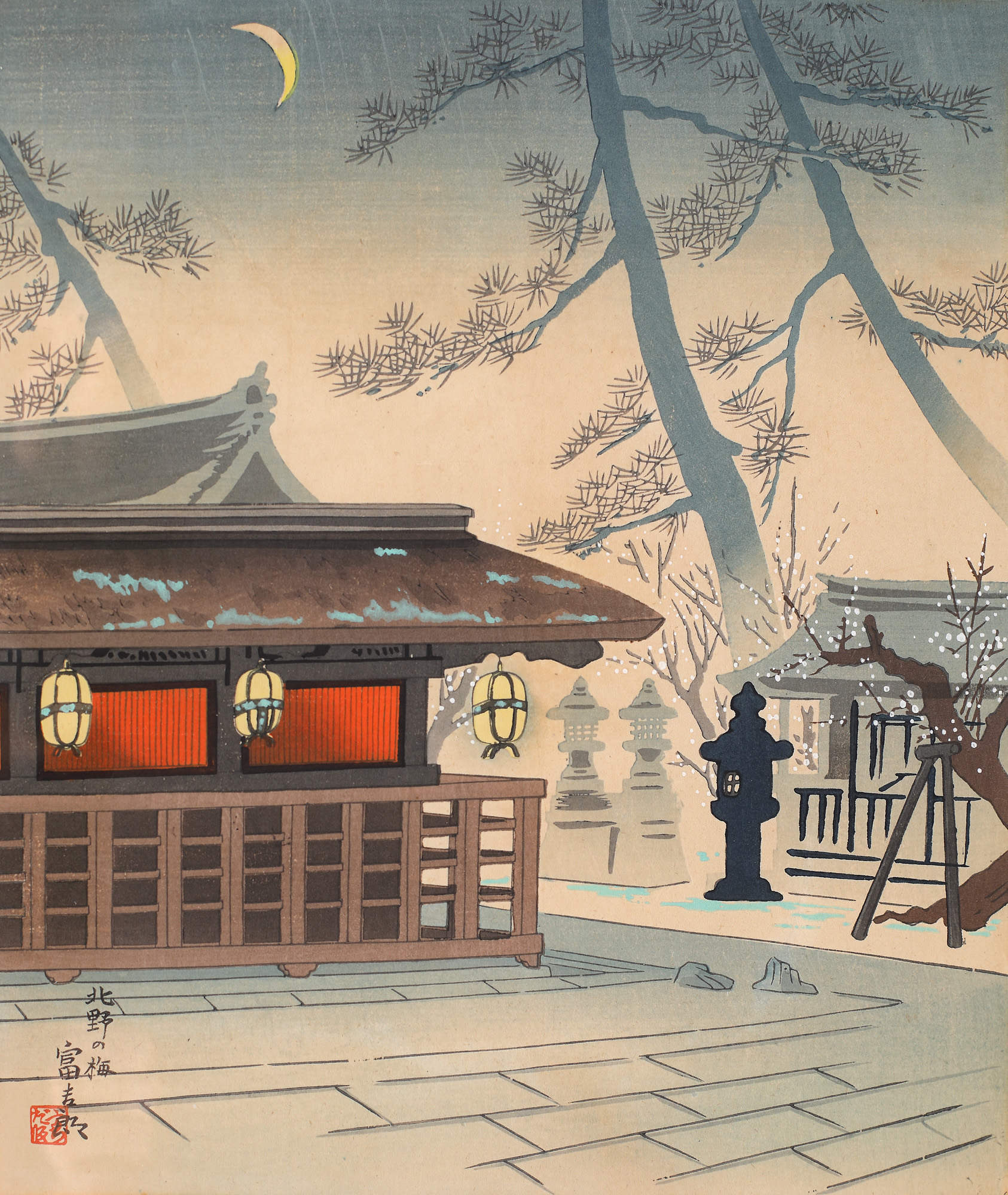 50. Prun înflorit la sanctuarul Kitano, din seria ”Cincisprezece priveliști ale Kyoto-ului (Hanga Kyoraku Ju-go Kei)” [1950]