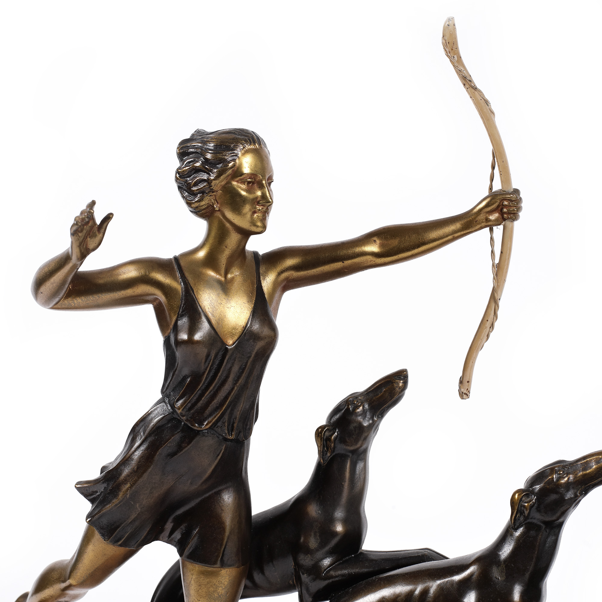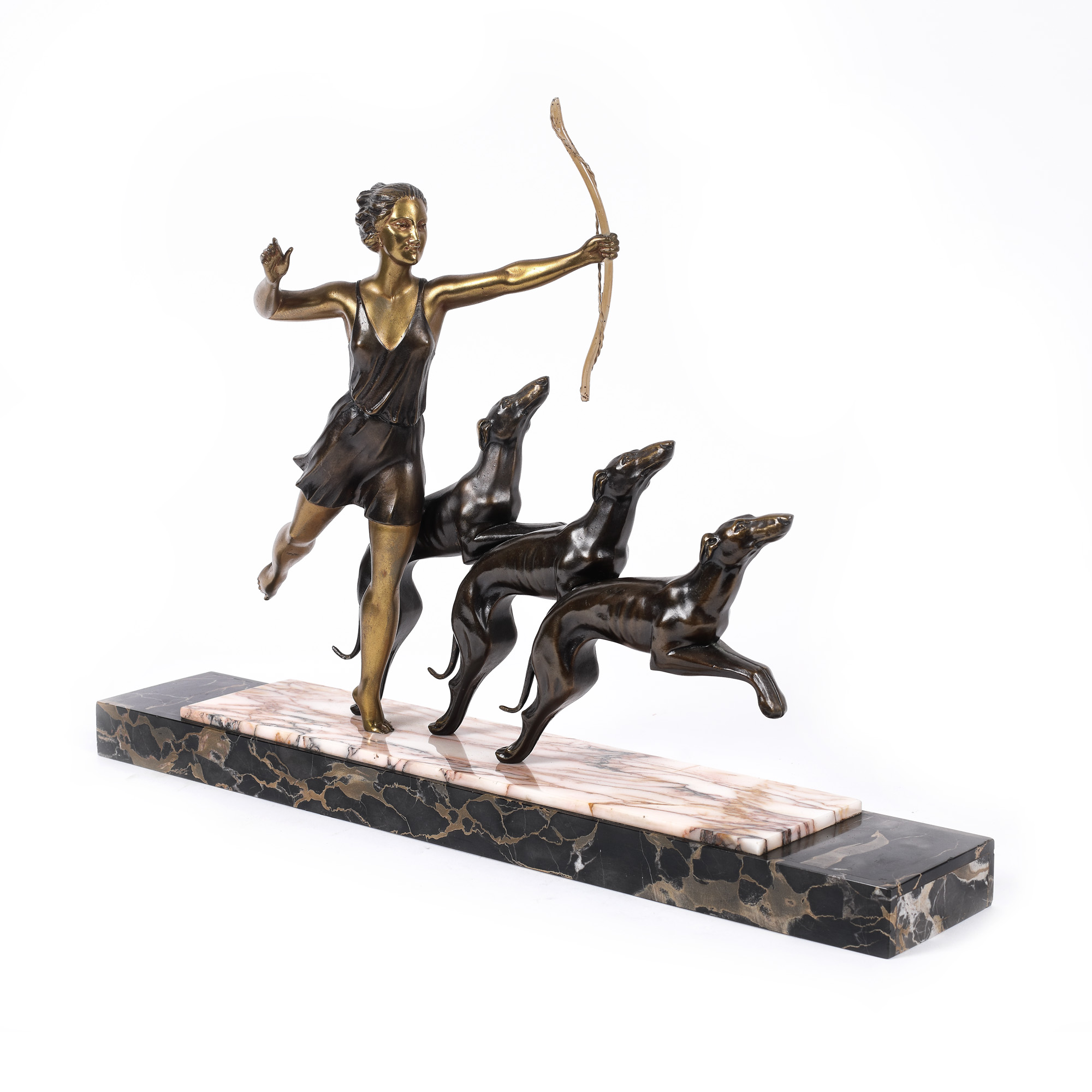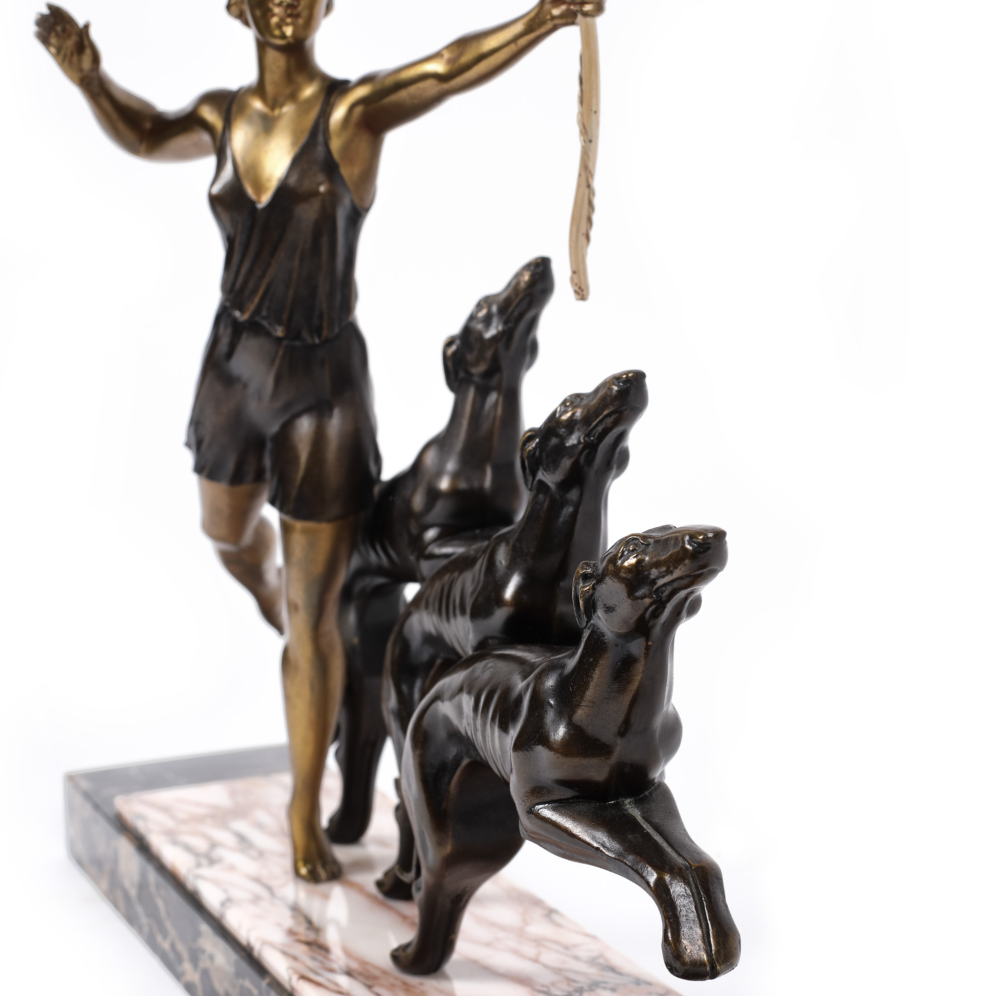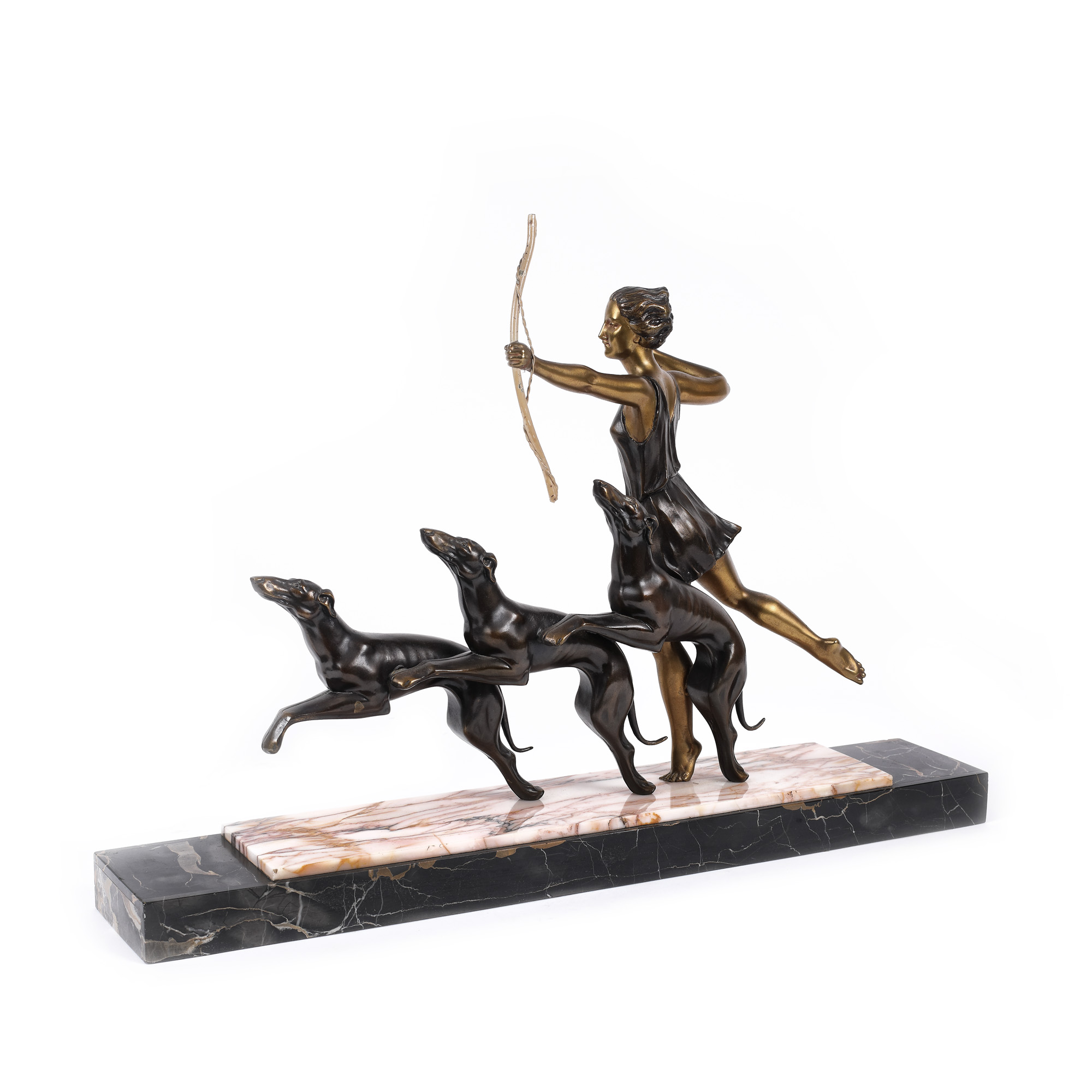 34. Statuetă Art Deco din bronz, cu blat din marmură Calacatta Paonazzo și Porto, reprezentând-o pe zeiția vânătorii, Diana și ogarii, cca. 1915