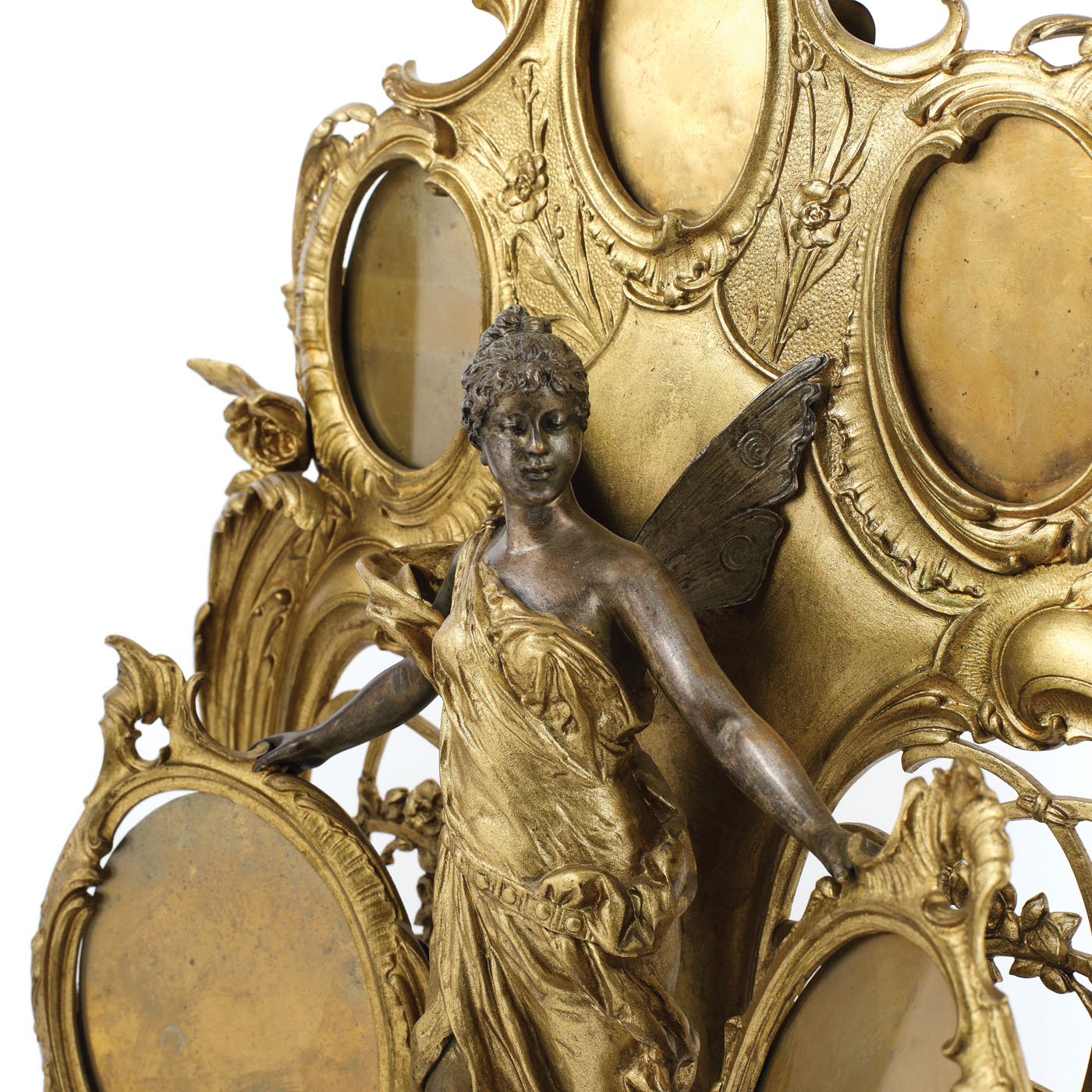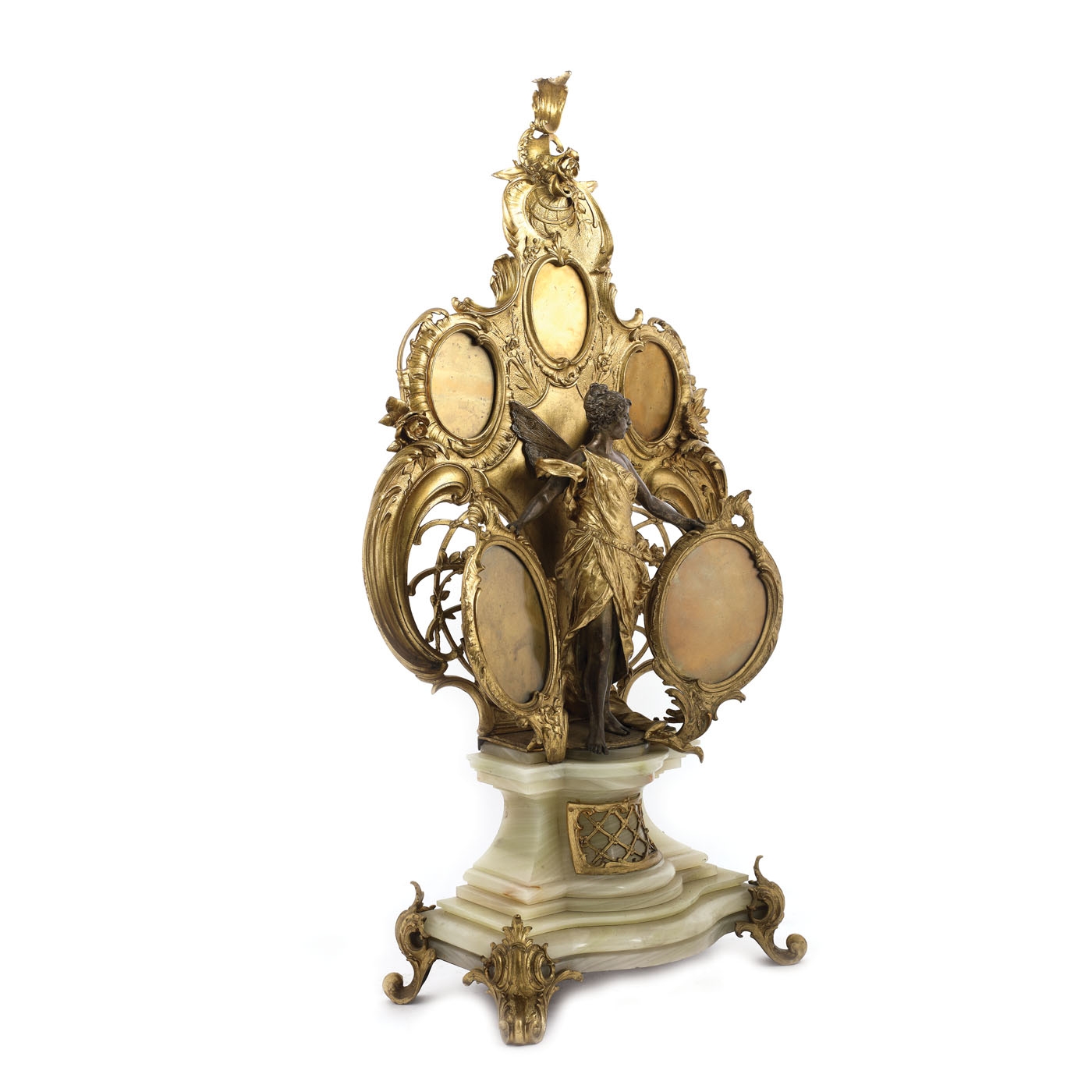 29. Monumentală ramă Eugen Börmel, de inspirație Rococo, pentru cinci fotografii, din bronz doré și onix, decorată cu elemente vegetale și figură feminină, cca. 1900