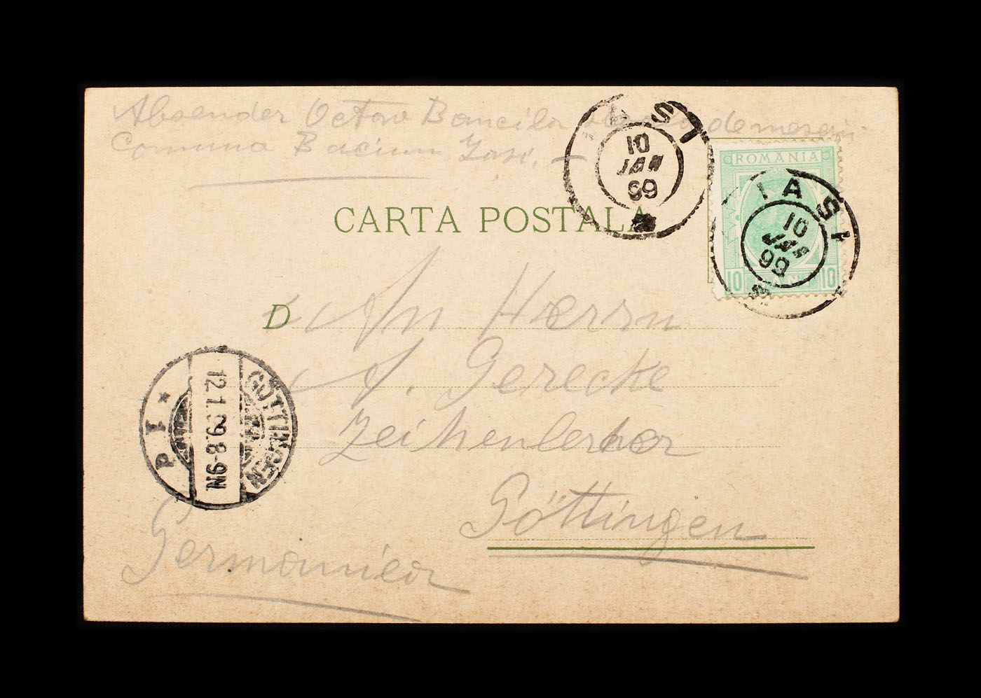 Circulată poștal de la Iași la Gottingen, cu semnăturile olografe a lui Octav Băncilă, Iohan Băncilă, G. Braun. Editori F. Iliescu și D. Grossu.