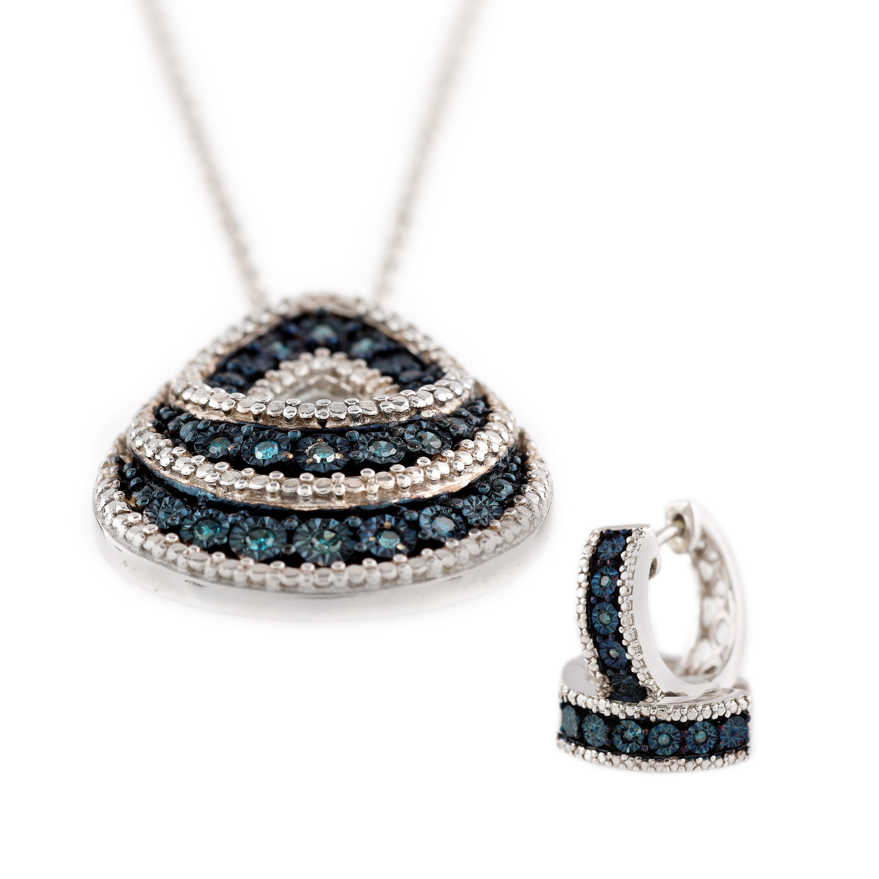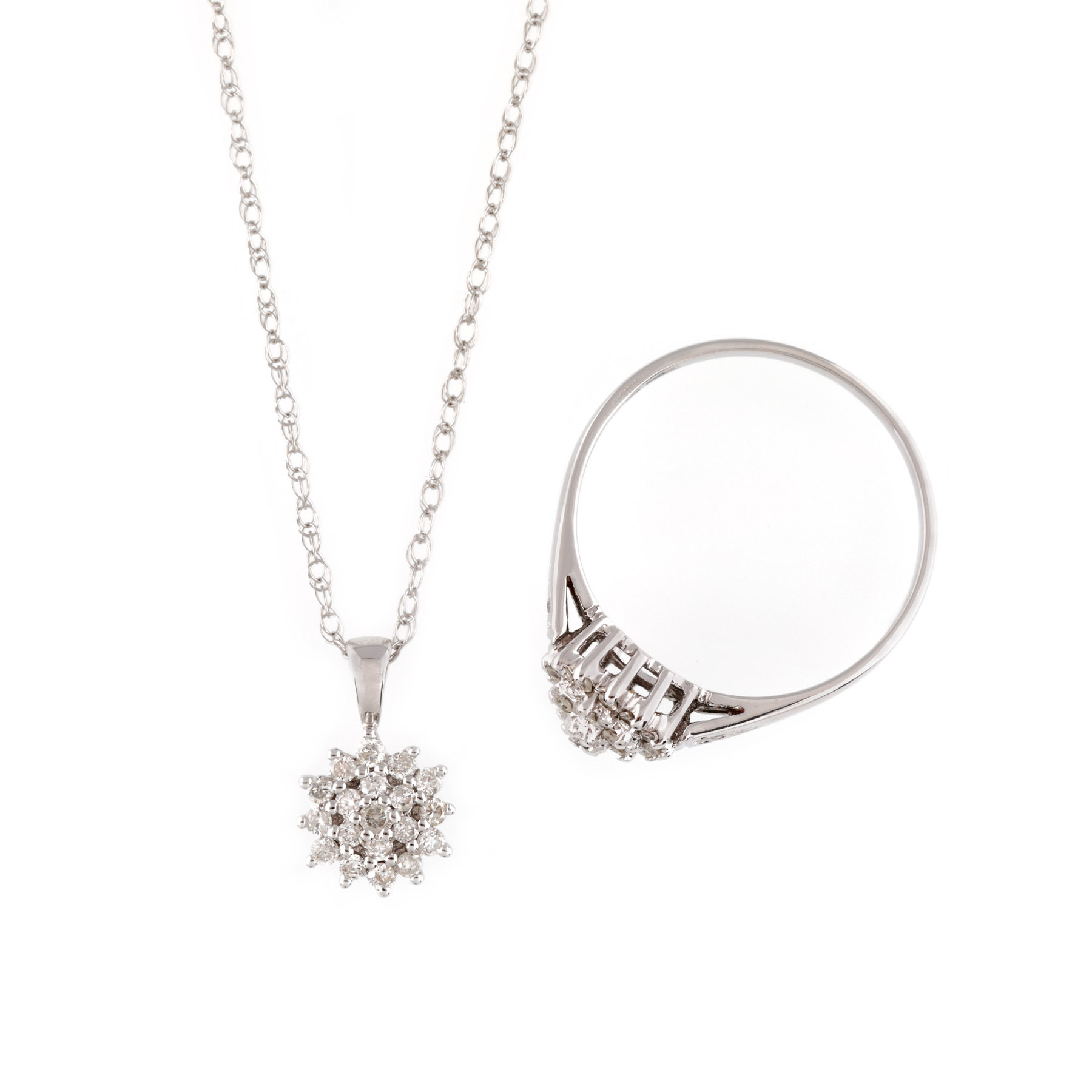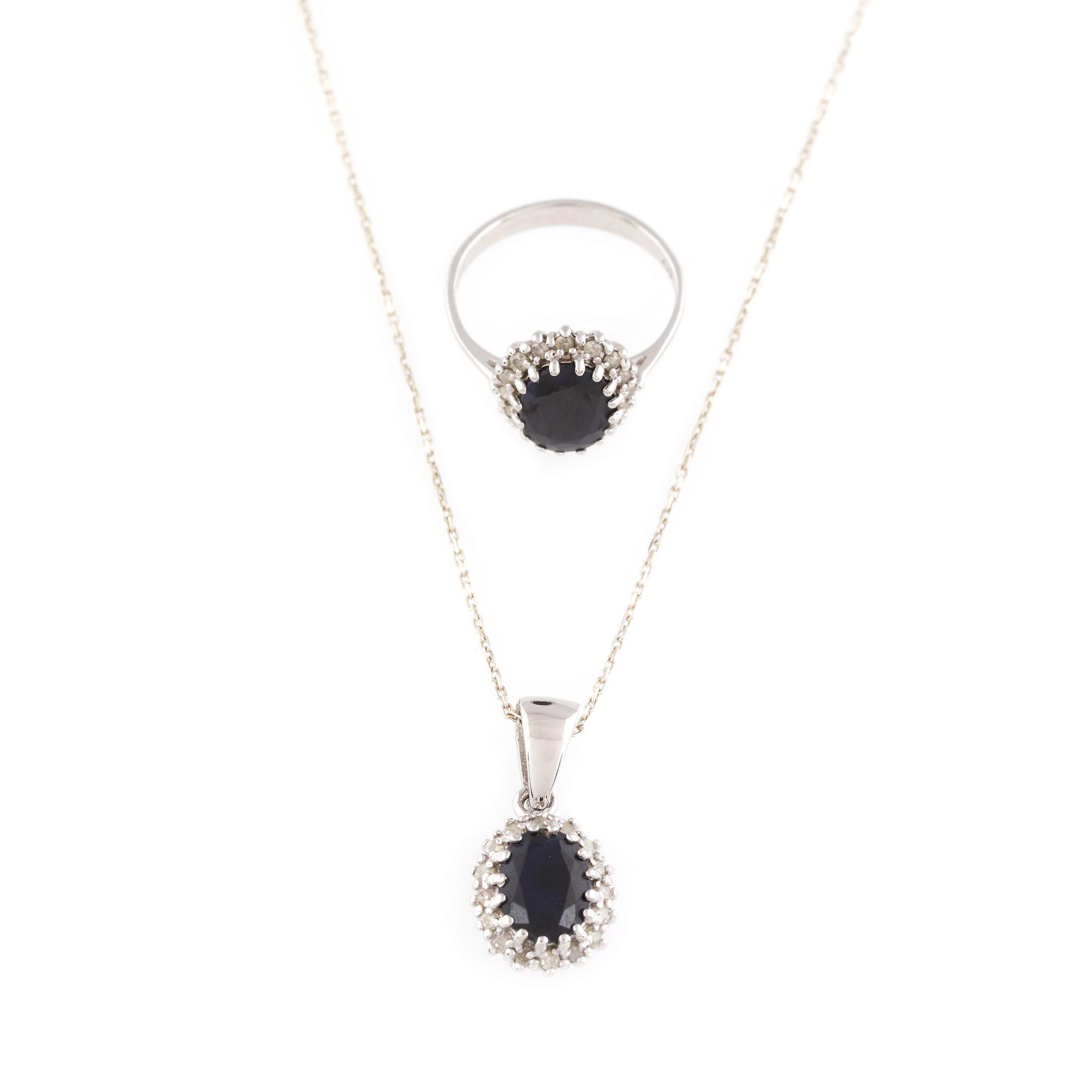10. Set din aur alb, alcătuit din lanț cu pandantiv și inel, decorat cu diamante