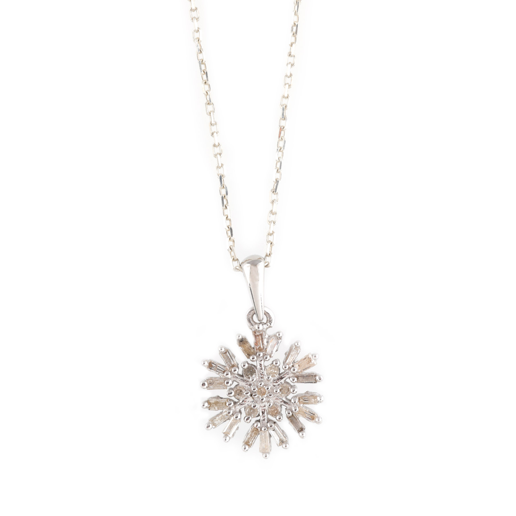 1. Lanț cu pandantiv din argint, în forma unui fulg de nea, ornat cu diamante rotunde și baguette