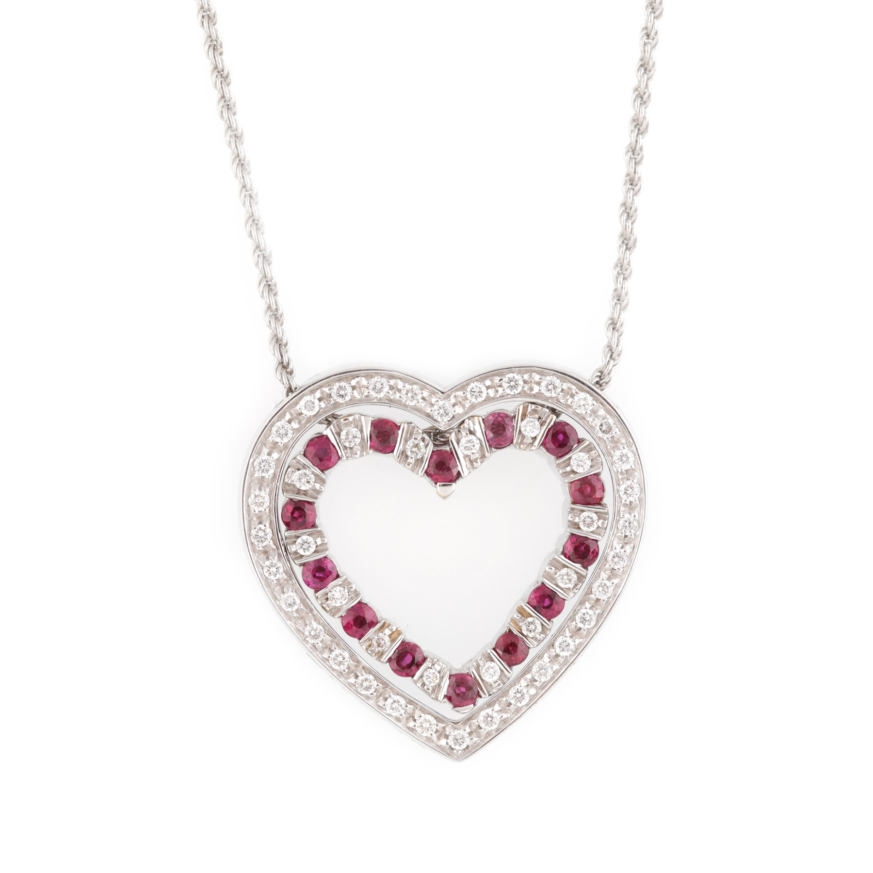 13. Lanț cu pandantiv Damiani din aur alb, în formă de inimă dublă, decorat cu diamante și rubine