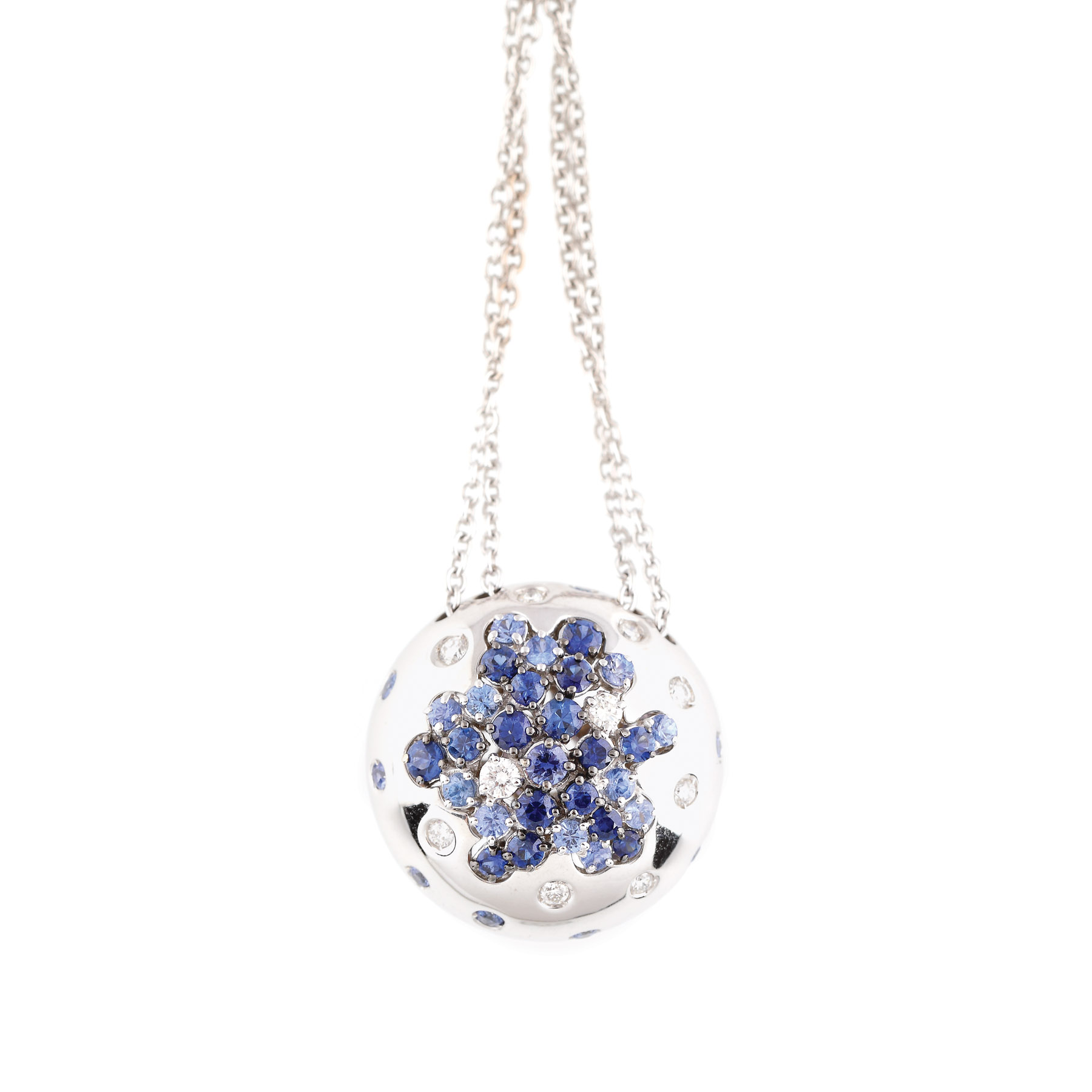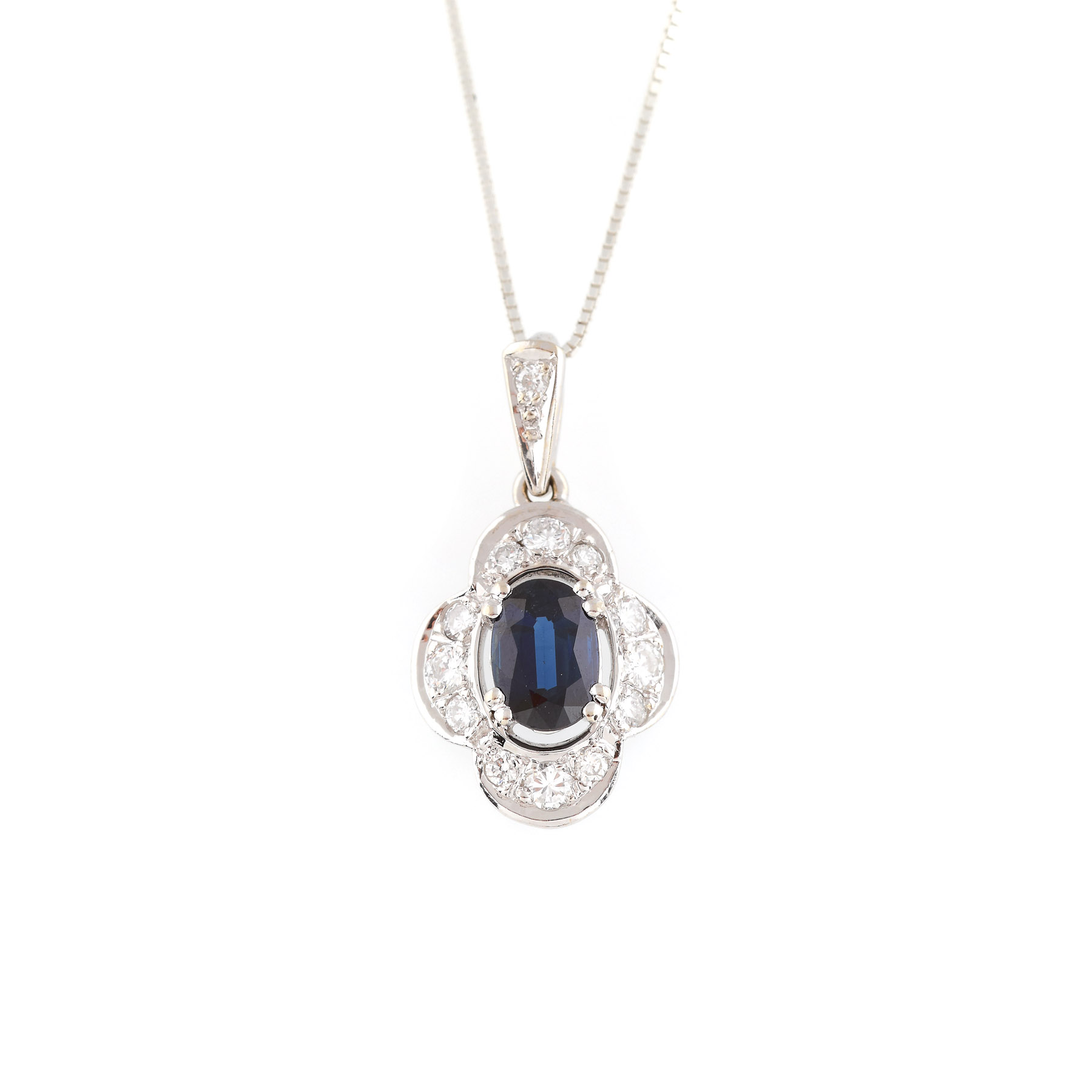 26. Lanț cu pandantiv din aur alb și argint, decorat cu safir și diamante