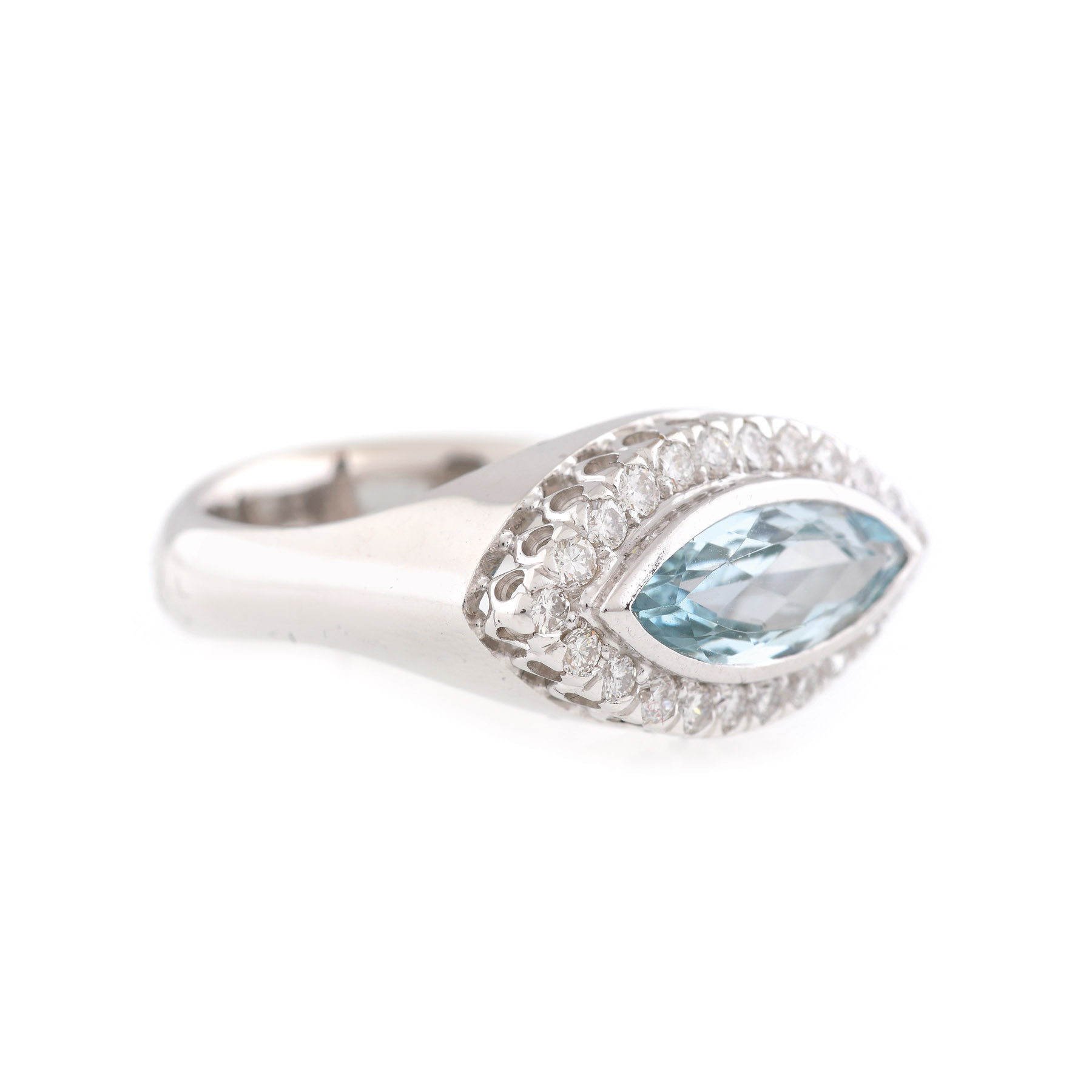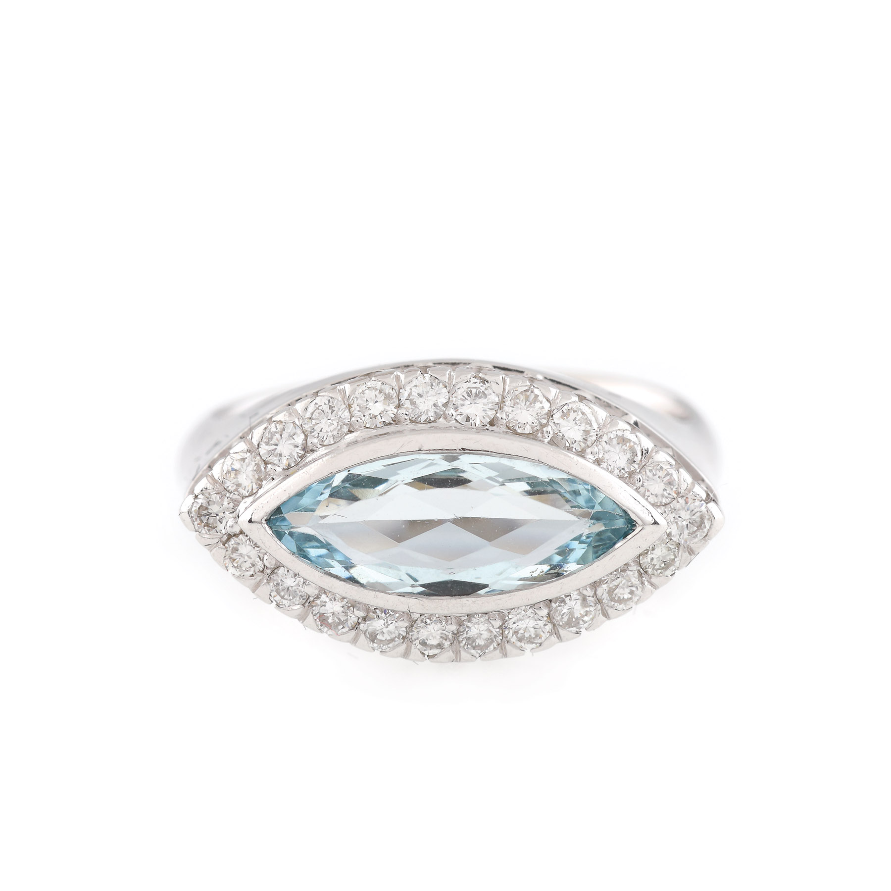 1 acvamarin marchiz fațetat, culoare bleu, claritate eye-clean, cca. 1,1 ct., 22 diamante rotunde briliant, culoare I-J, claritate VS-SI1, cca. 0,35 ct.