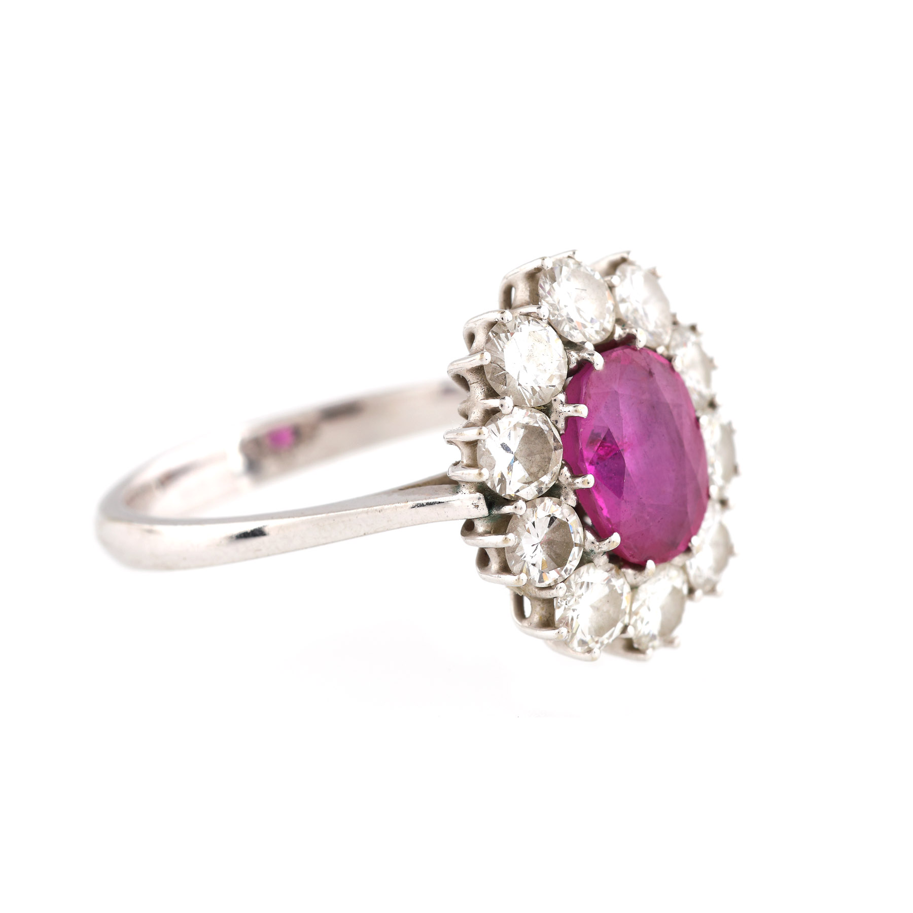 1 rubin oval fațetat, culoare roșu, claritate SI, cca. 1,7 ct. și 10 diamante rotunde briliant, culoare H-I, claritate VS, cca. 1,6 ct. Rubinul prezintă o ciobitură și o cavitate.