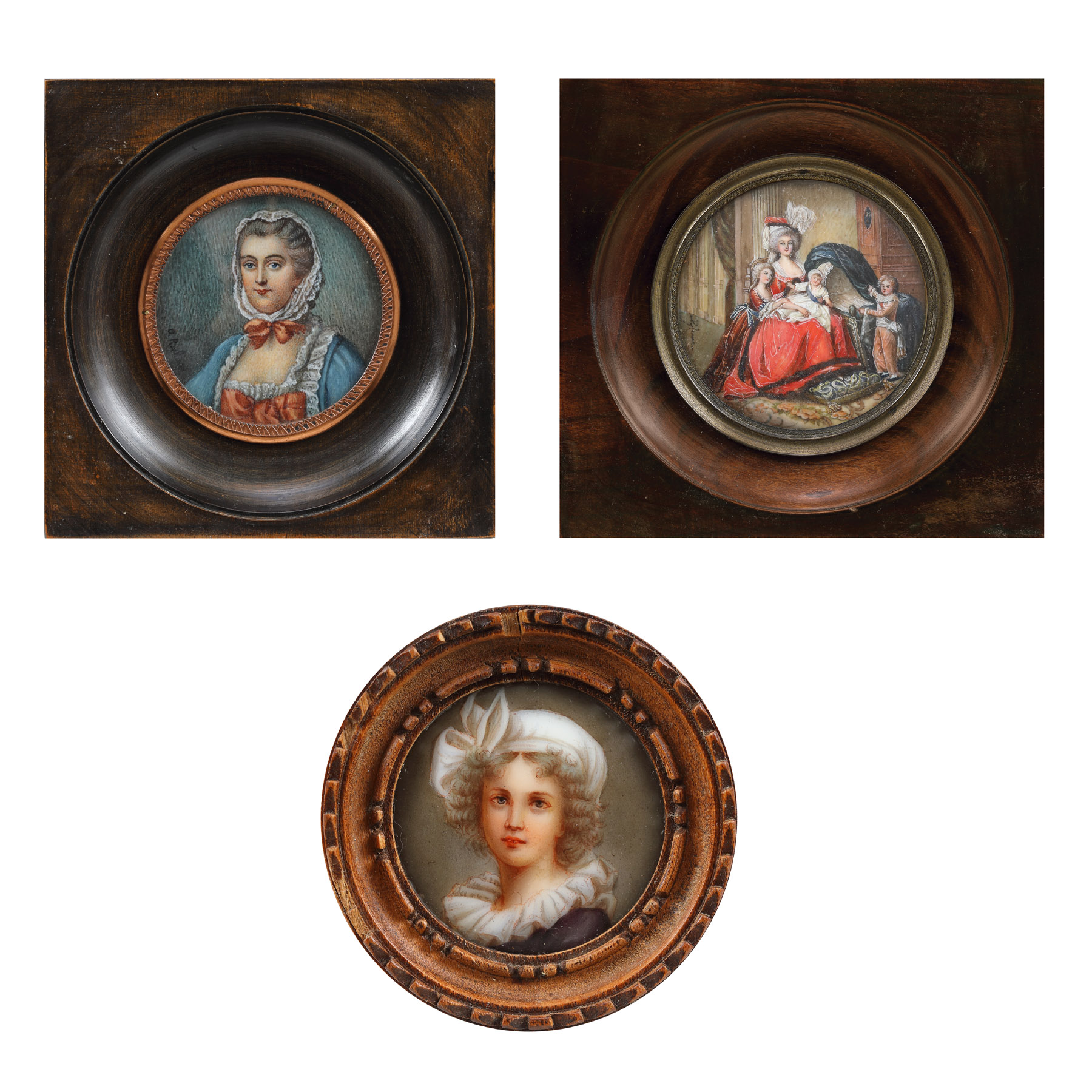 44. Lot format din trei miniaturi pictate pe os