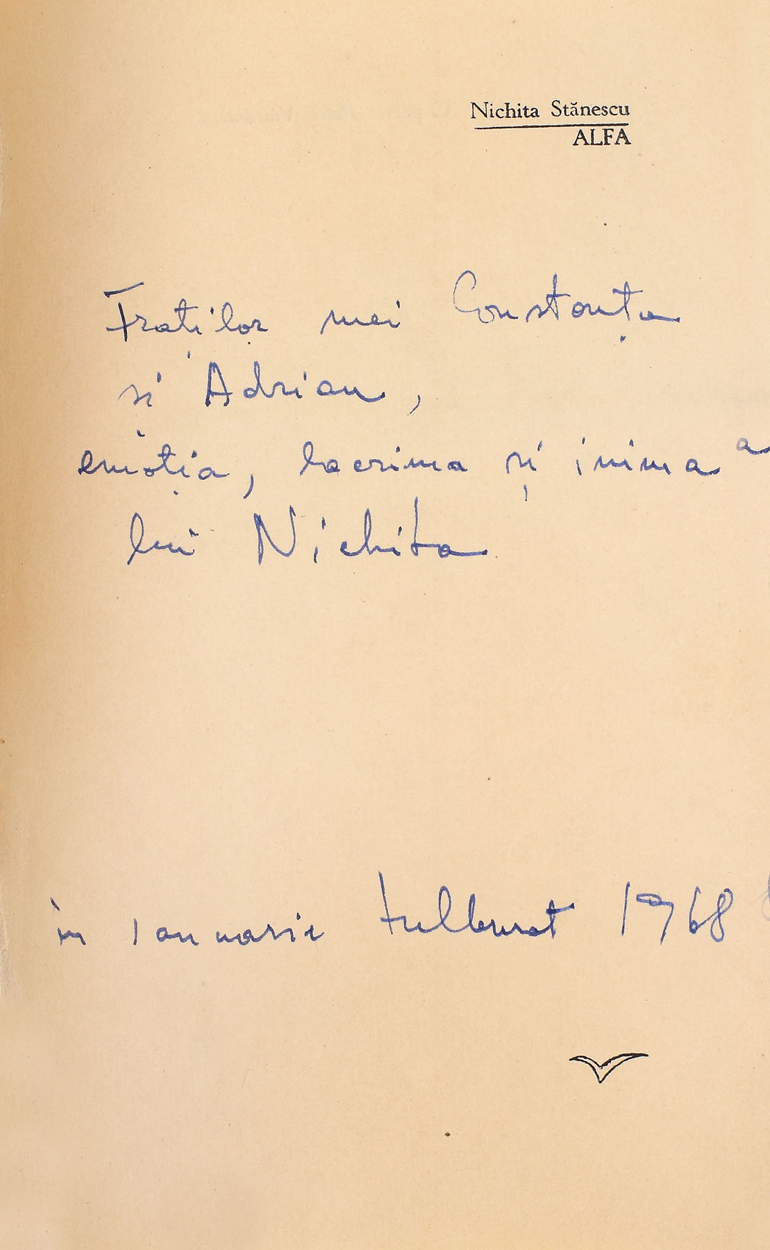 6. ”Alfa”, de Nichita Stănescu, București, 1967, cu dedicația olografă a autorului către frații săi, Adrian și Constanța