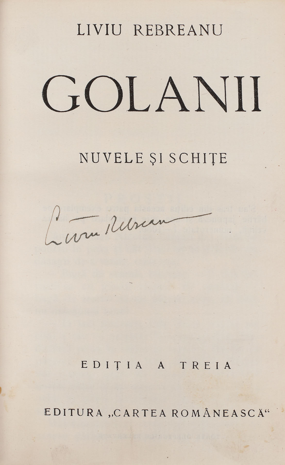 2. ”Golanii”, de Liviu Rebreanu, București, 1925, cu semnătura olografă a autorului