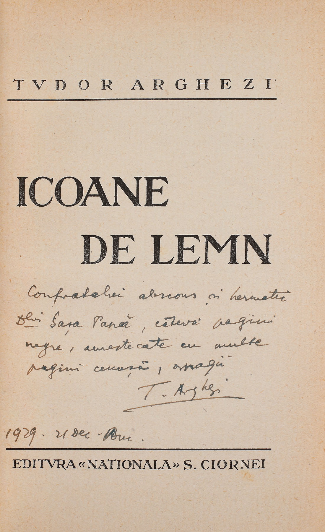 30. ”Icoane de lemn”, de Tudor Arghezi, București, 1929, cu dedicația și semnătura olografă a autorului către Sașa Pană, provine din colecția poetului avangardist Sașa Pană