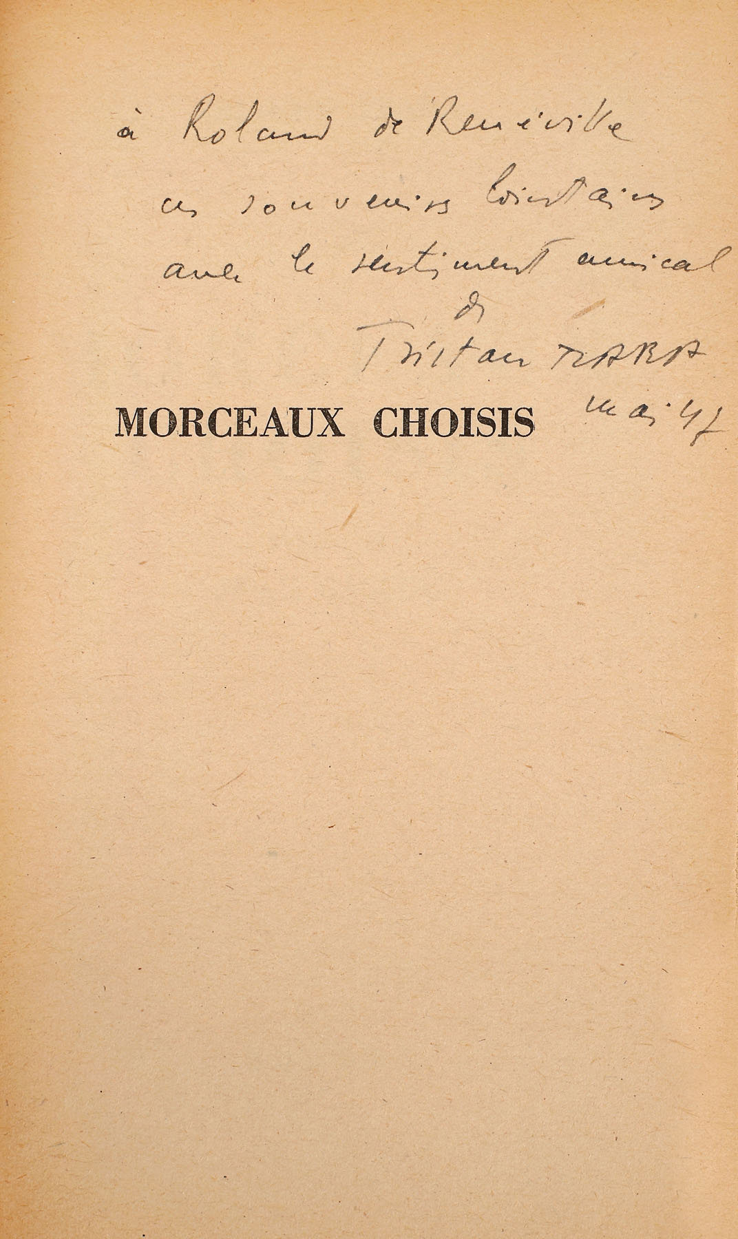 40. ”Morceaux choisis”, de Tristan Tzara, franceză, Paris, 1947, cu dedicația olografă a autorului către poetul și eseistul francez Rolland de Renéville