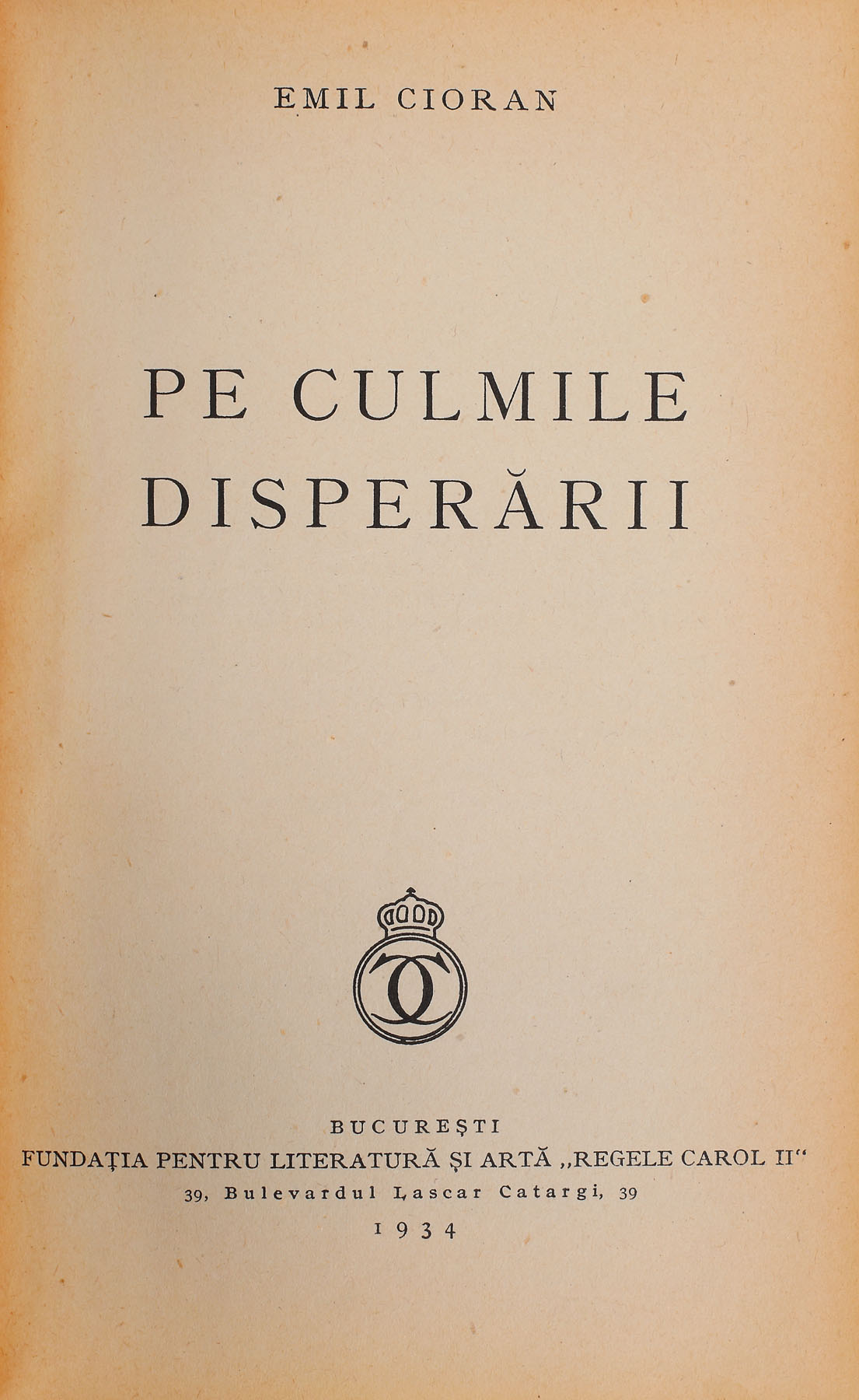 31. ”Pe culmile disperării”, cartea de debut a lui Emil Cioran, ediție princeps, București, 1934