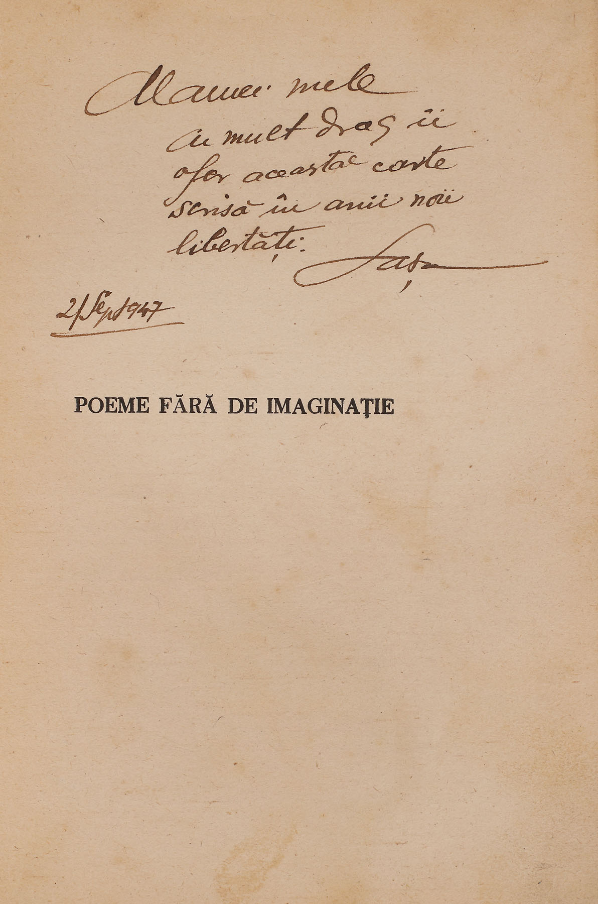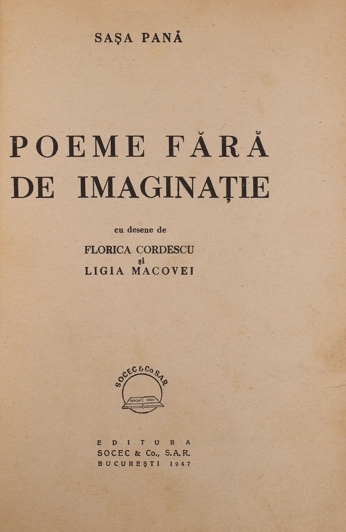 29. ”Poeme fără de imaginație”, de Sașa Pană, cu desene de Florica Codrescu și Ligia Macovei, București, 1947, cu dedicația și semnătura olografă a autorului către mama sa